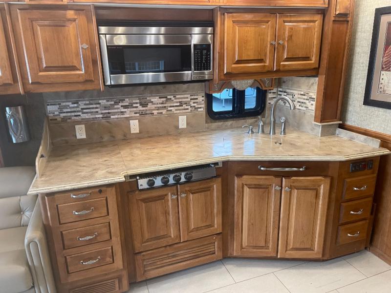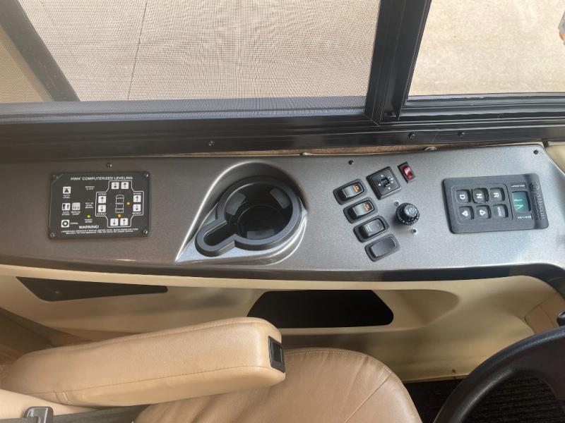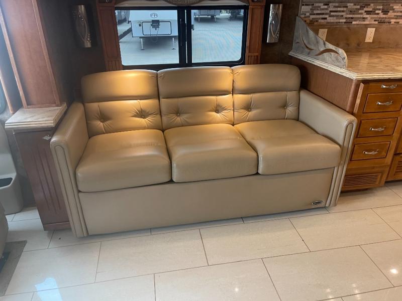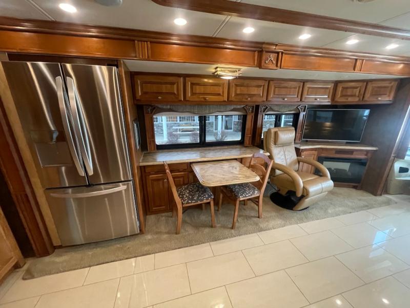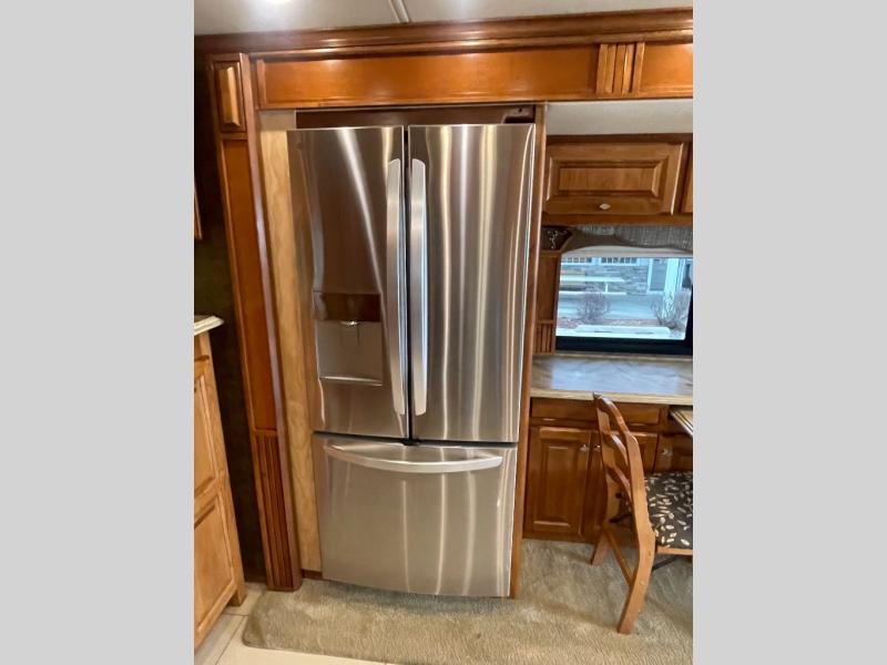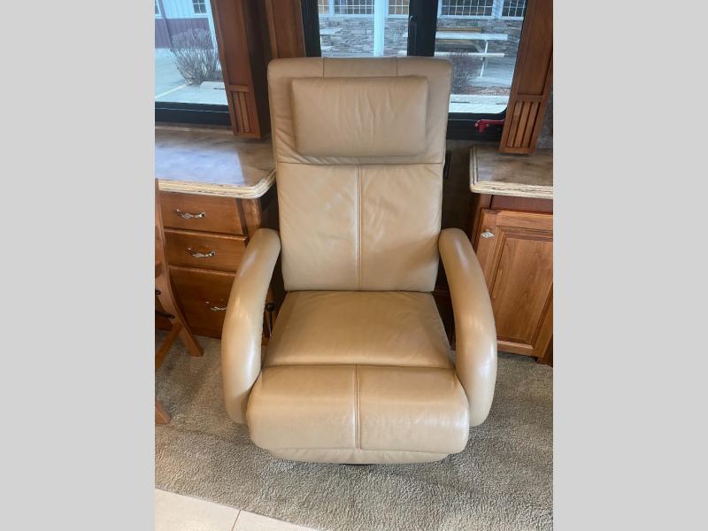 The road side slide out holds a sofa bed, booth dinette, overhead cabinets and a residential refrigerator. You may choose a u-shaped dinette, a dinette with computer workstation and/or an entertainment center with on leather lift recliner and flip table.