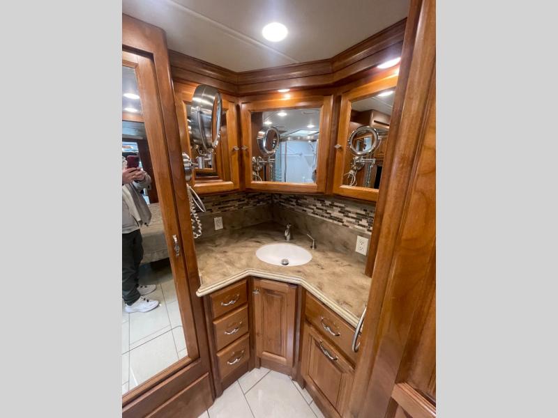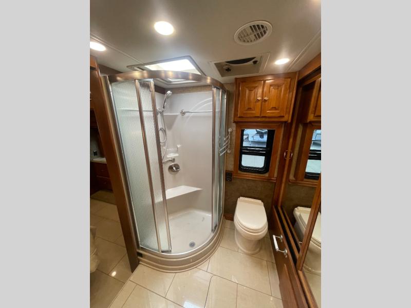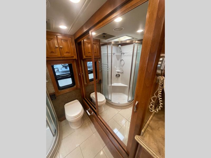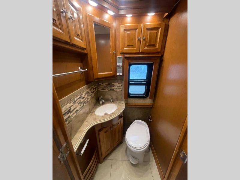 Moving forward, a split bath includes a vanity sink, overhead cabinet and shower on the curb side with a private toilet, vanity sink and overhead cabinet area on the other side.