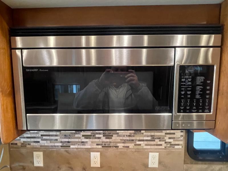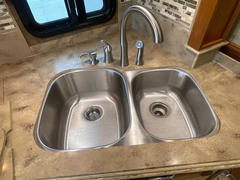In the living area, two slides opposite each other really open up the floor space. The curb side slide holds an angled double kitchen sink, a range, an overhead convection microwave, overhead cabinets and a sofa bed. You may choose two leather lift recliners in place of the sofa bed or an exterior TV.
