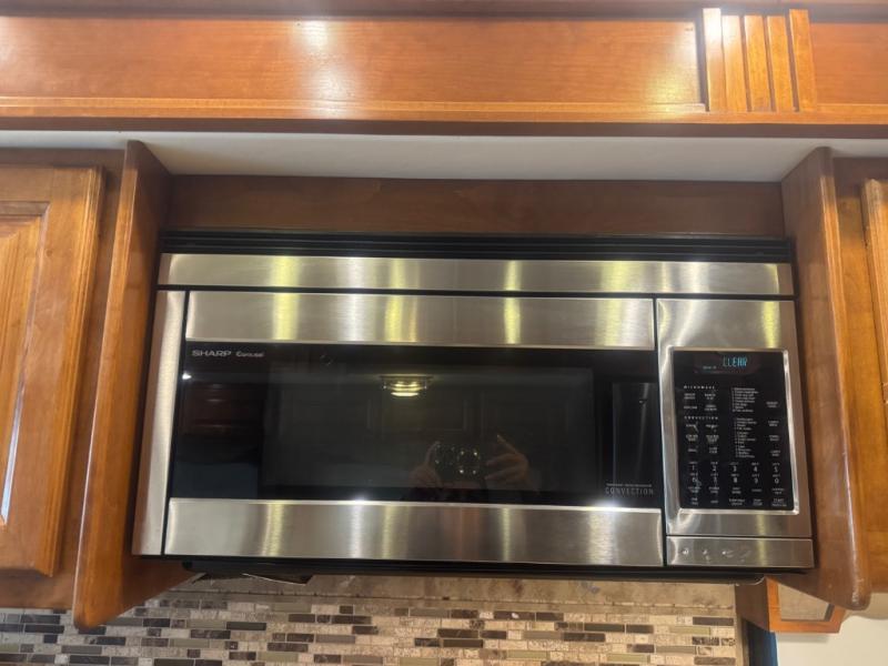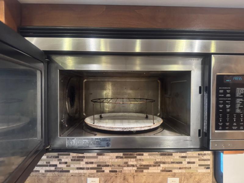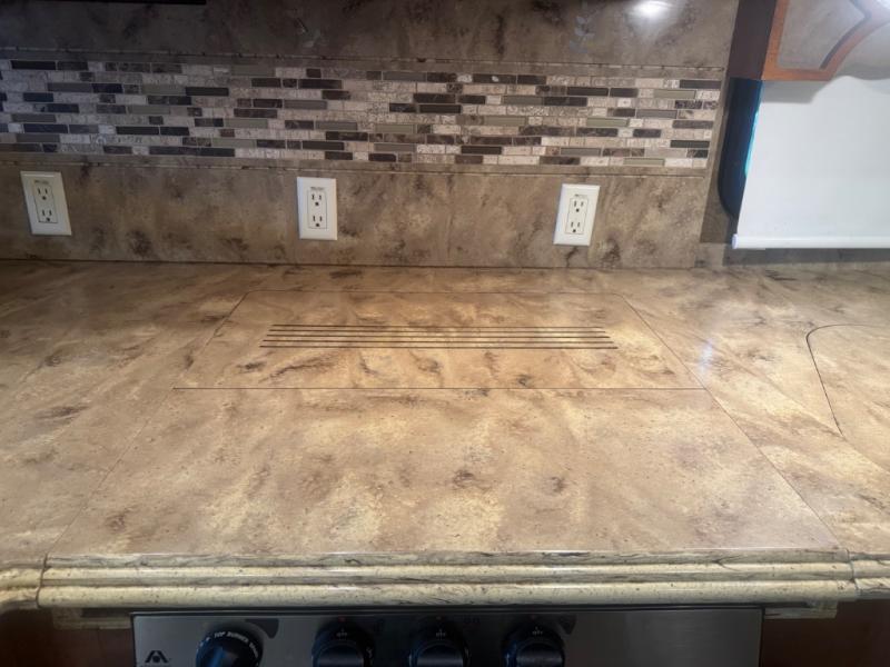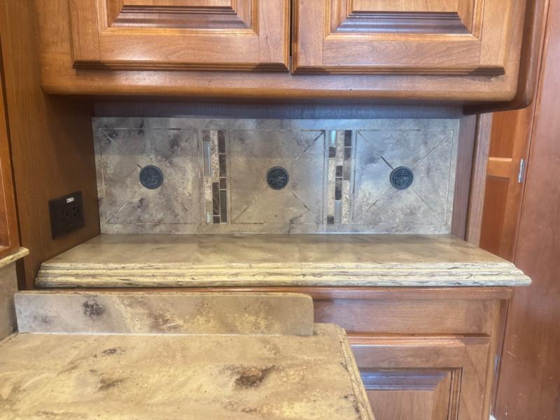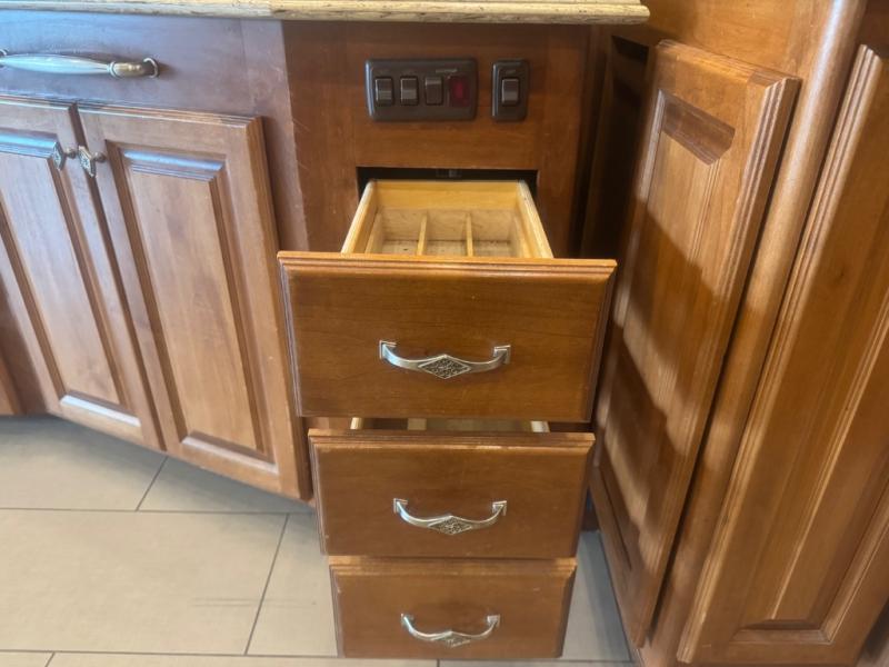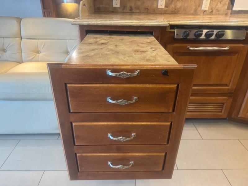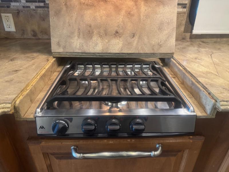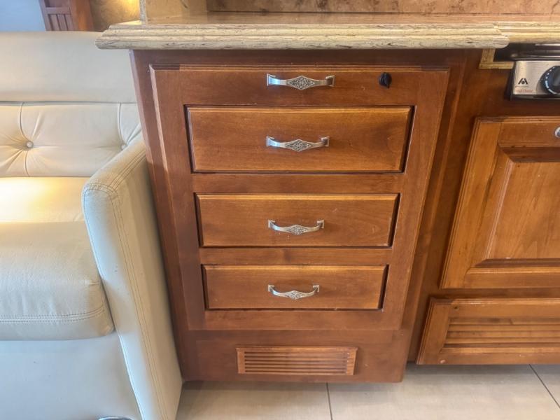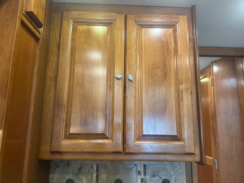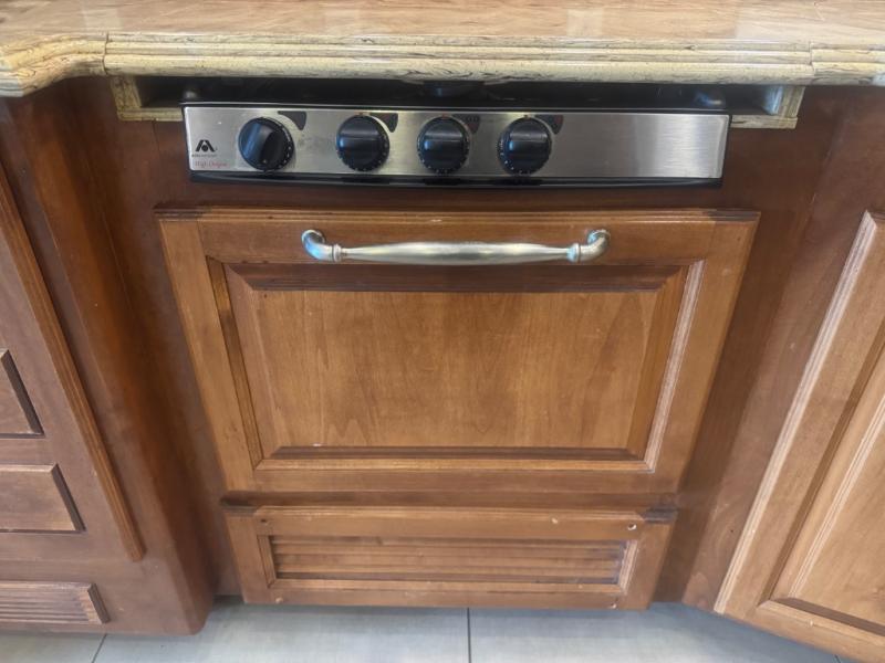 Inside, the 40 QTH floorplan offers four spacious slide-outs that create an open, residential-style living space. The living area features ultra-comfortable seating, premium cabinetry, and elegant finishes, giving you the feeling of a luxury condo on wheels. A fully equipped kitchen with solid-surface countertops, residential refrigerator, convection microwave, and abundant storage ensures you can prepare meals with ease while on the road.