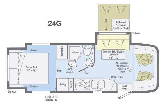 Winnebago View Profile Class C Coach w/Rear Queen Bed Slideout w/Storage Both Sides of Bed, Step Down to Living Area w/Wardrobe, Bath w/Corner Shower, Toilet & Round Sink, Slideout Comfort Sofa/Sleeper 54" x 75", 26" LCD TV, Refrigerator, Pantry, 2 Burner Cooktop, Dbl. Kitchen Sink w/Overhead Cabinets Throughout and More. Available Options May Include: Optional Bedroom TV, UltraLeather, L-Shaped Sectional Dinette w/Table IPO Comfort Sofa Sleeper.