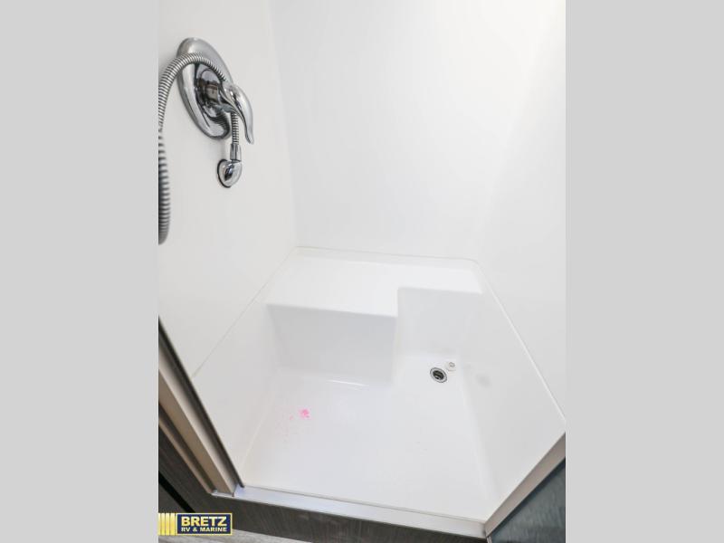Upon entering the travel trailer, you will notice along the rear wall that there is a dinette. Next to the dinette there is a sofa with a LED TV above the sofa.