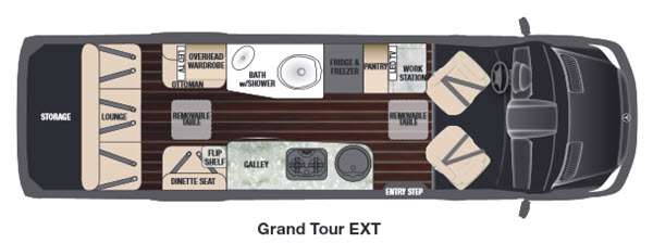 This Interstate Grand Tour EXT Class B Touring diesel coach offers interior seating for 6 individuals and sleeping accommodations for two.