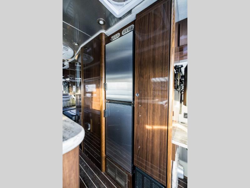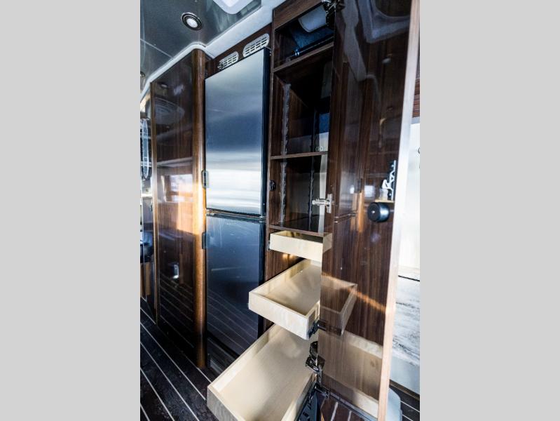 The galley has a sink, two burner range, and flip-up shelf along one side. The opposite side offers a large pantry and refrigerator with freezer.