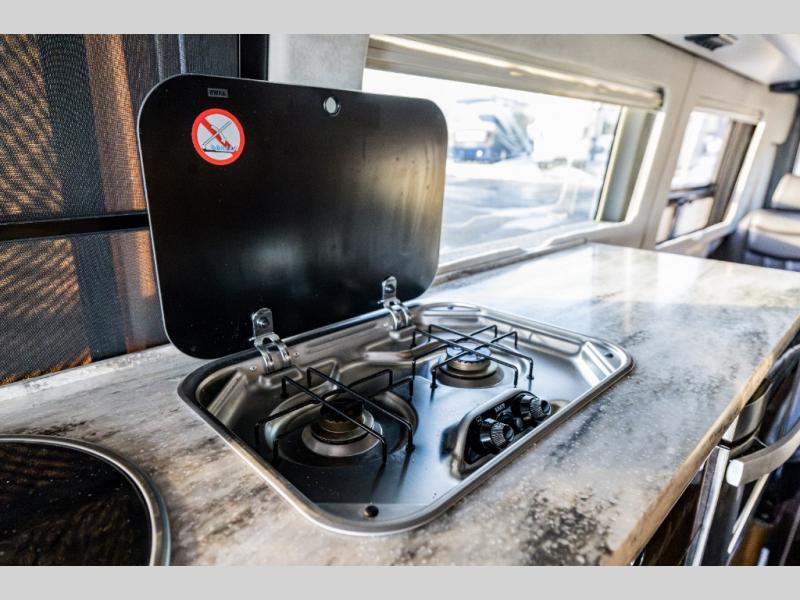 Step inside and find a convenient conversation area with the driver and passenger seats swiveled around. There is a removable table between the driver and passenger seat which allows for ease while eating or easy ability to play a game. Behind the driver's seat there is a work station and a LED TV.