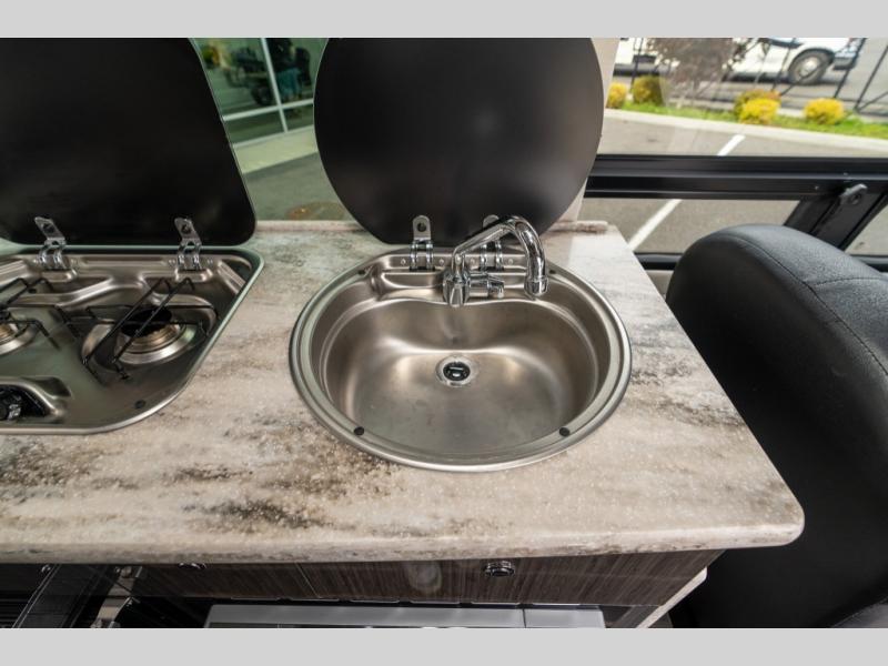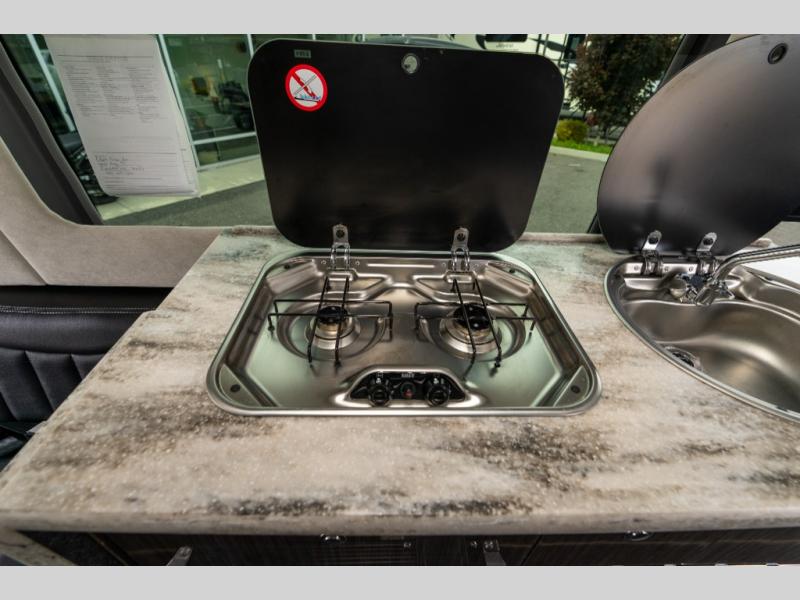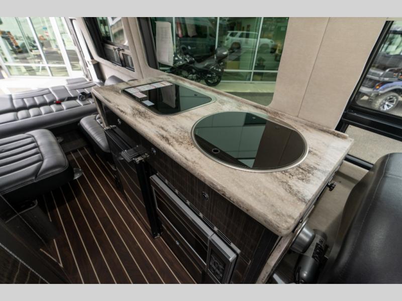 On the right side of the coach there is a round galley sink, overhead cabinets and a two burner cook-top, plus more.