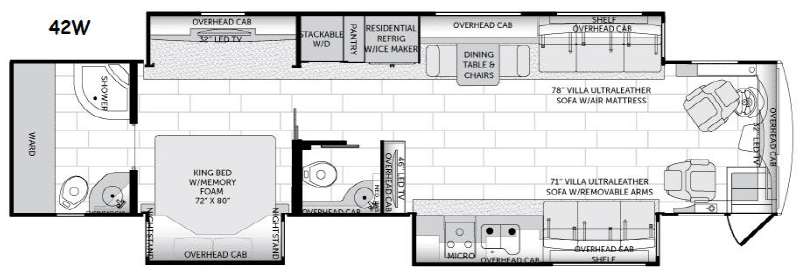 In the front of the motor home you will find a 46" LED tv, a slide with a microwave, three burner range, double kitchen sink, and sofa. There is a front 32" LED tv for your enjoyment. The opposite side of the motor home has a full wall slide which includes, a sofa, dining table & chairs, refrigerator with ice maker, pantry, stackable washer and dryer, and a 32" LED tv in the bedroom.