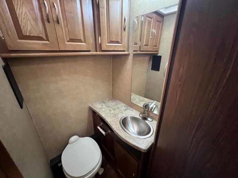 Continue on back through the coach where you will walk through a bath area to find a private toilet and vanity with sink on your right, and shower on your left. There are overhead cabinets for storage as well.