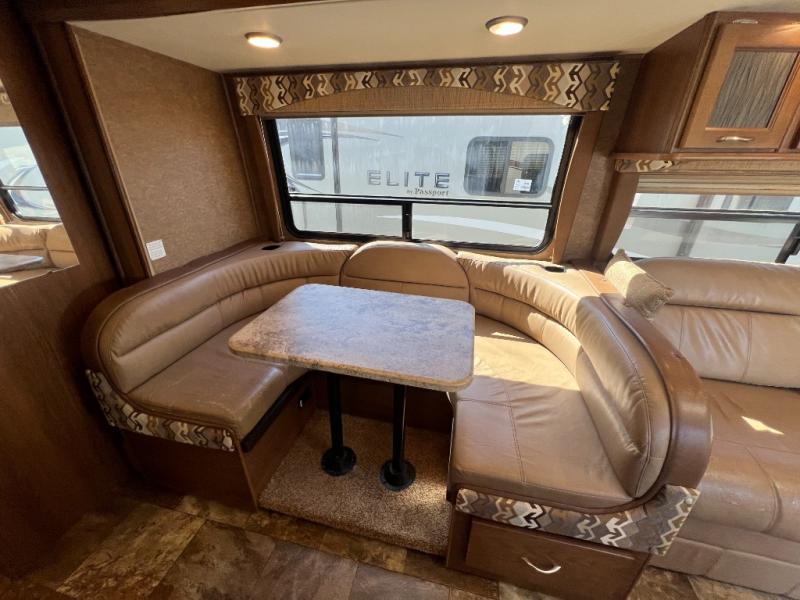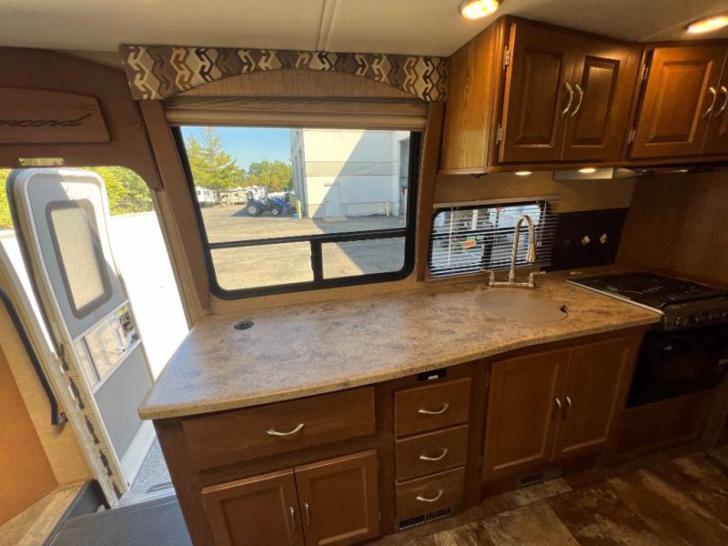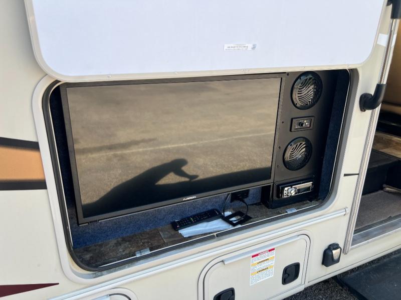 Straight ahead when you enter notice the large slide out sofa and u-shaped dinette. Both offer much seating space to enjoy a meal at, or to just relax and kick back after a fun filled day of adventure and exploring. You will also enjoy the 32" TV provided in the entertainment center located above the cab area.