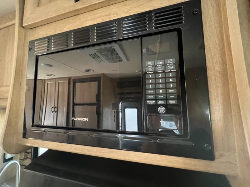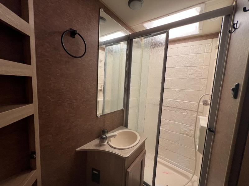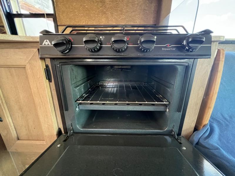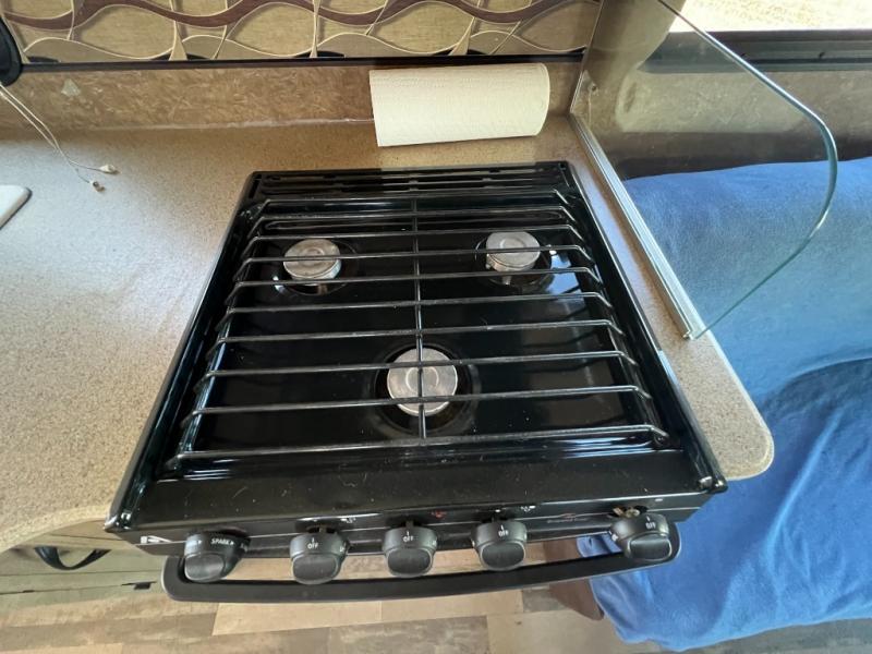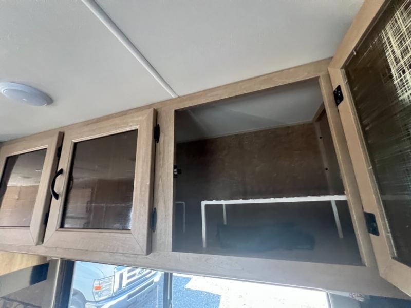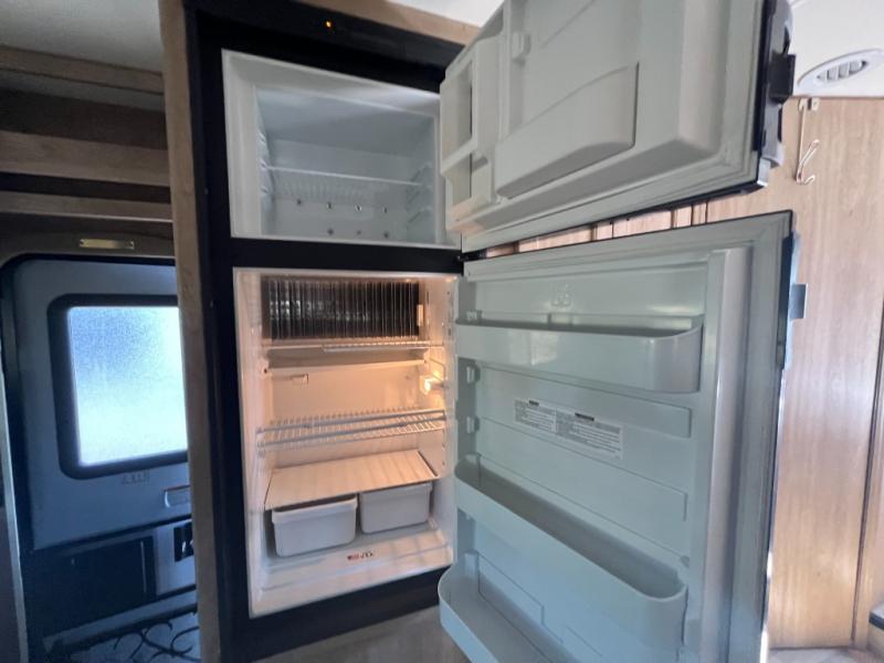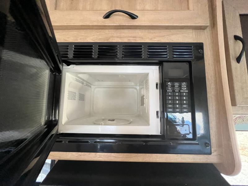 Step inside and find a J-lounge with 18" extension and overhead cabinets to the right of the entrance. To the left of the entrance there is a refrigerator. Across from the J-lounge you can sit and relax on the sofa. Above the sofa you will find an overhead cabinet where you can store blankets or games. Next to the sofa there is a double kitchen sink, three burner range, microwave, and pantry.