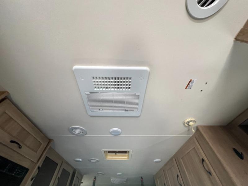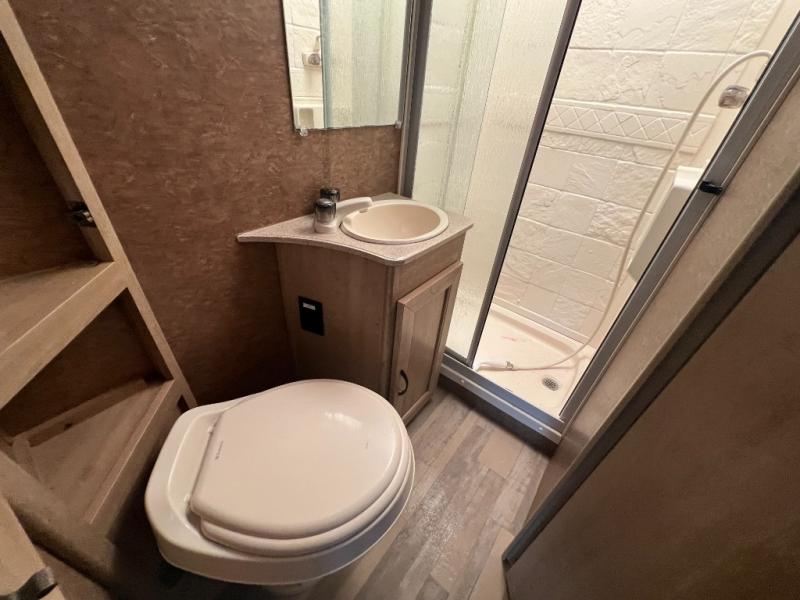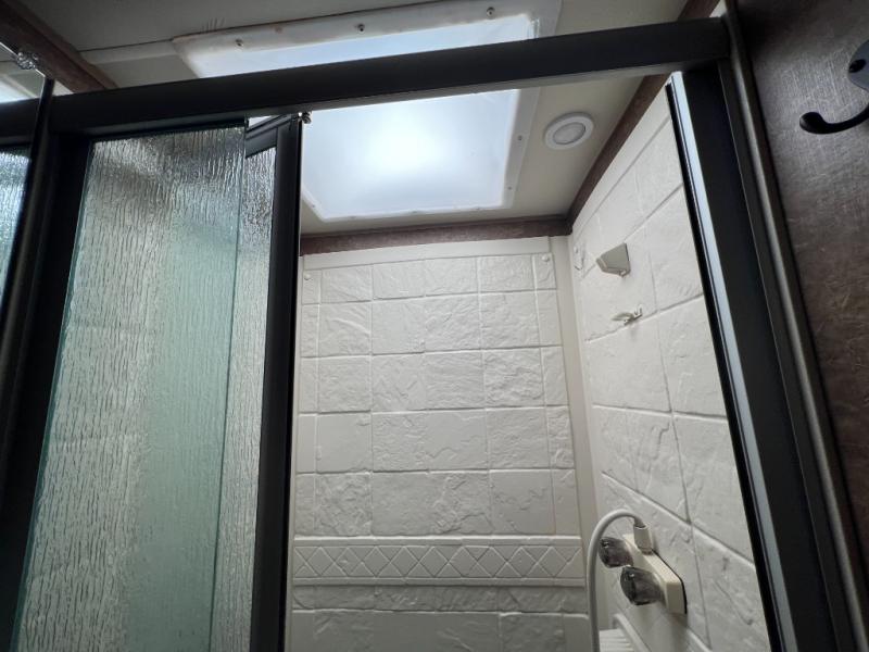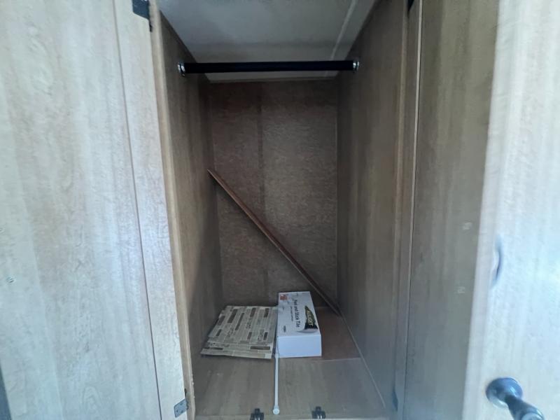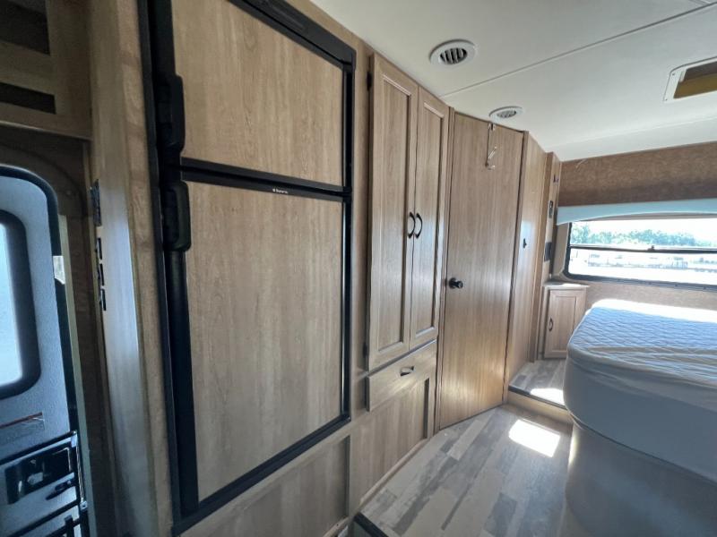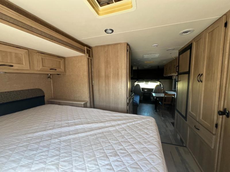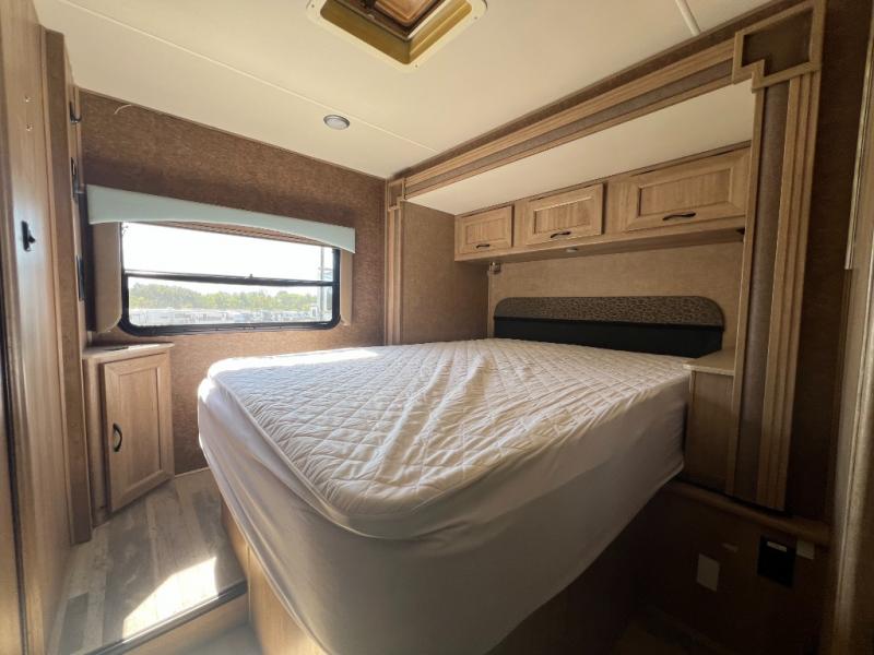 In the rear of this Freelander 26RS find a bathroom with toilet, sink, and shower. Next to the bathroom there is a wardrobe for hanging your clothes. The bedroom is also in the rear of the motor home. You will find a queen bed slide with a nightstand, plus so much more!