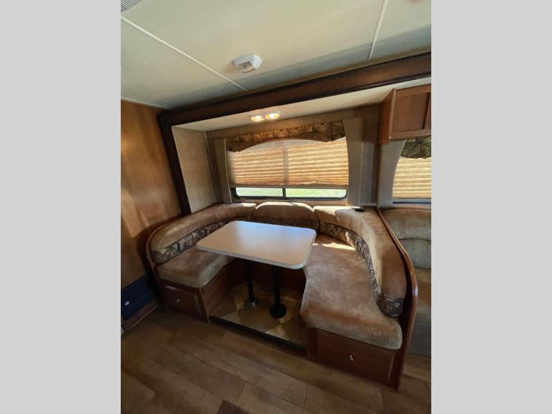 To the left of the entry door find all the kitchen amenities you need to prepare and cook food for your family on the move. There is a large counter area, double kitchen sink, three burner range with overhead microwave, and refrigerator. You will also find overhead storage, plus lower cupboards and drawers for all of your things.