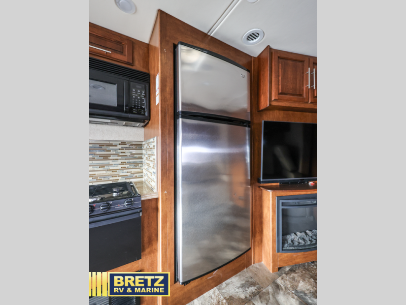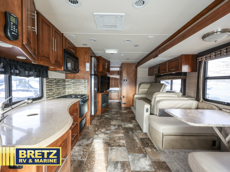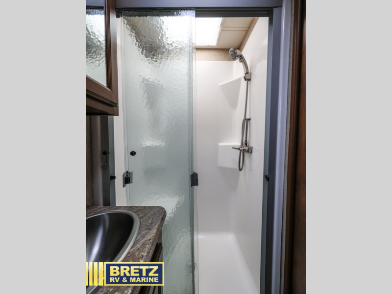 Model 360DL offers plenty of living space with the large slide out booth dinette and L-shaped hide-a-bed sofa found on the road side. There is overhead storage above the sofa, and a convenient centrally located 39" TV for your enjoyment.
