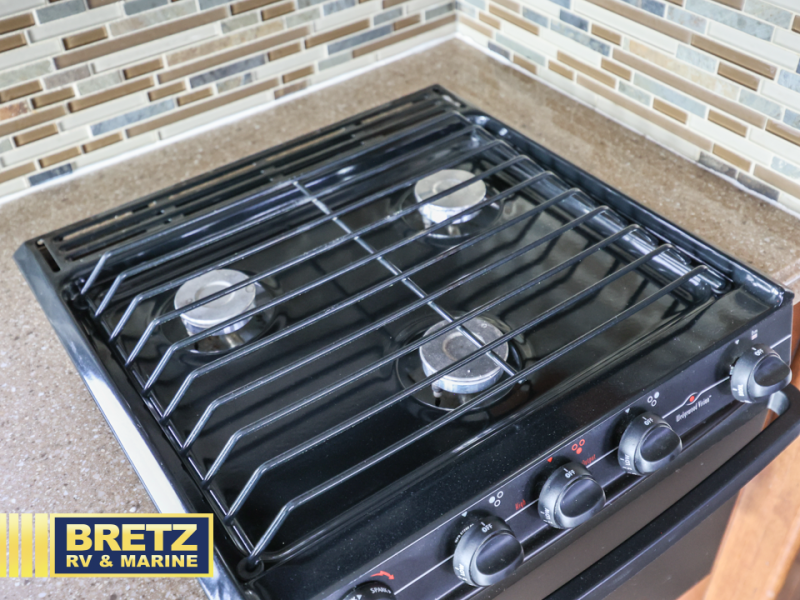On the opposite side of the coach find all the amenities to create meals and snacks while on the move. There is a refrigerator, three burner range, microwave oven, and double kitchen sink. With plenty of overhead cabinets for dishes and things, plus lower cupboards too, you will have ample storage.