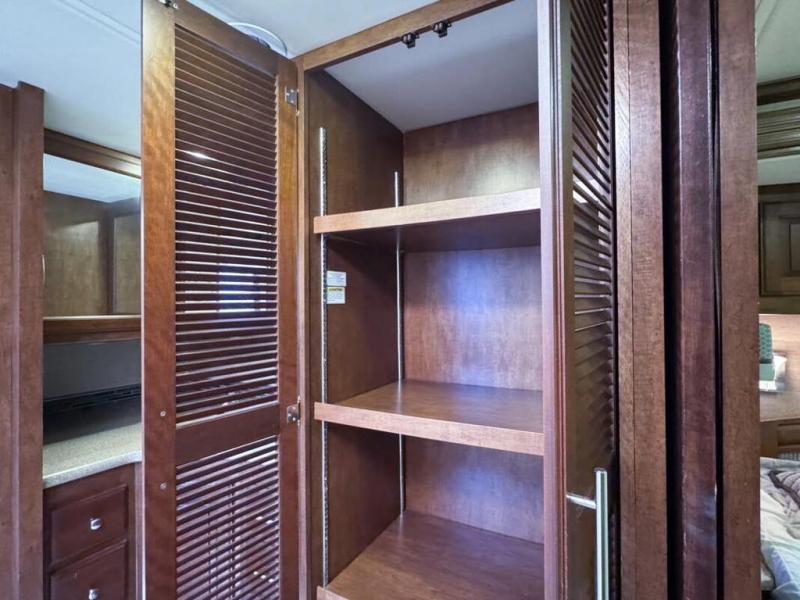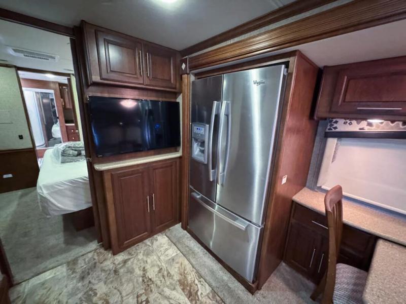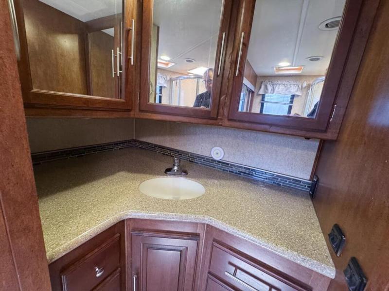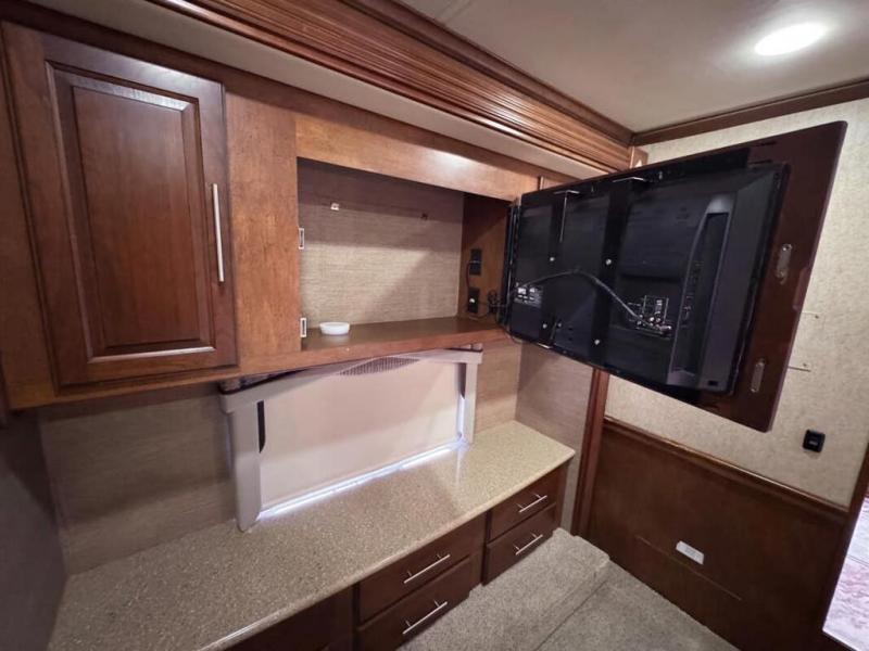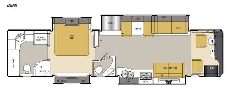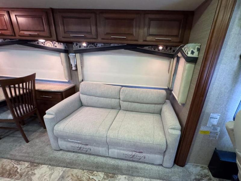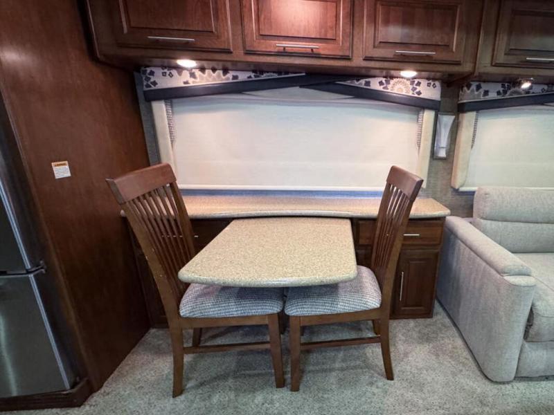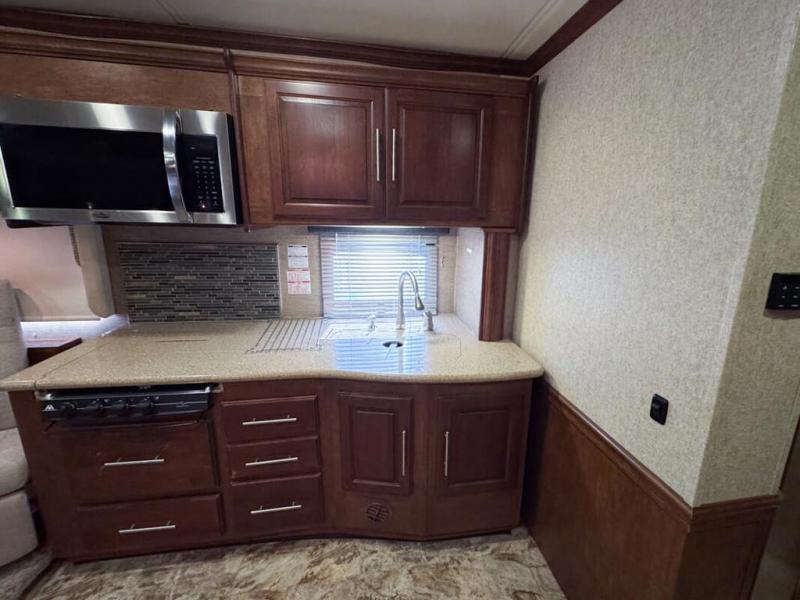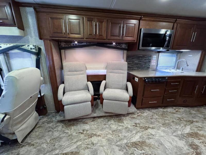 As you enter you will quickly feel the spaciousness with dual opposing slides opened up in the main living area. There is a hide-a-bed sofa with a TV above the sofa, two burner range, microwave, and double sink on the curbside of the coach. The road side features a second slide that provides a refrigerator, booth dinette, and second sofa. With all of this seating you will enjoy plenty of time to relax and enjoy your latest surroundings as you reminisce about the days adventure and begin planning the next.