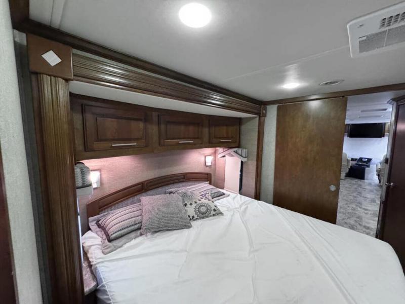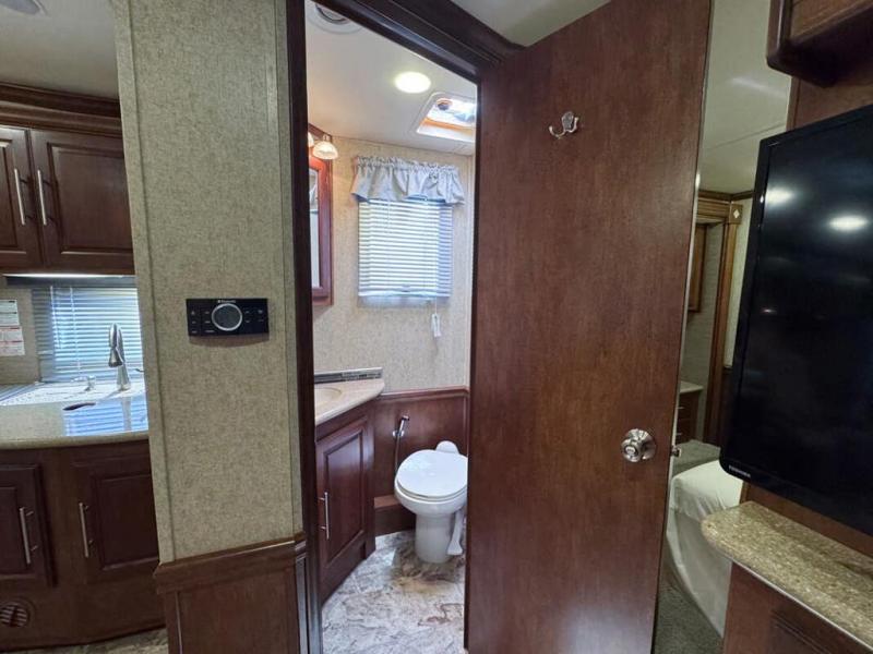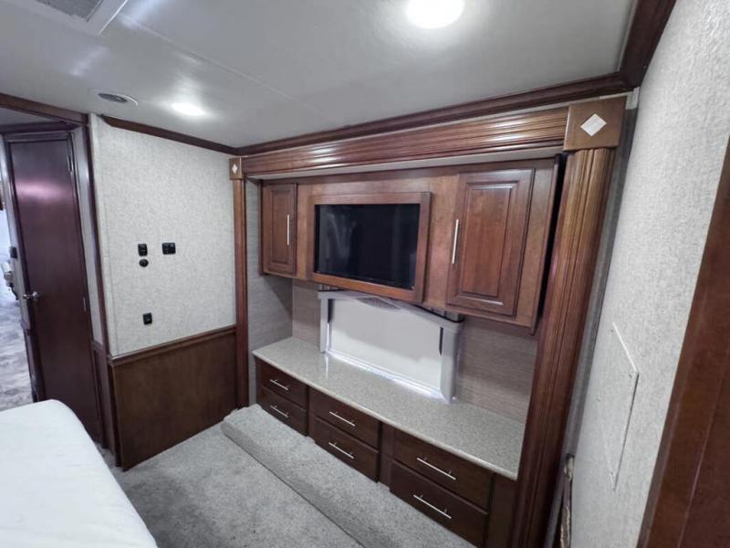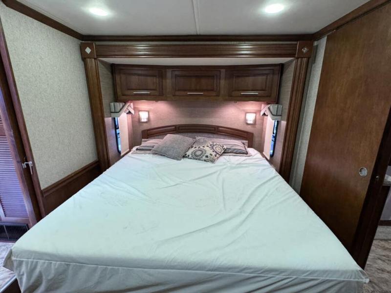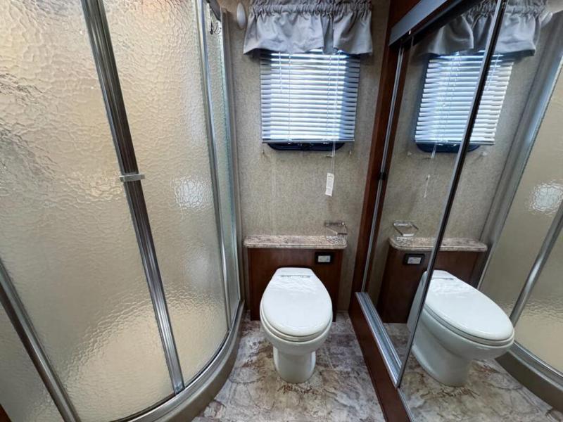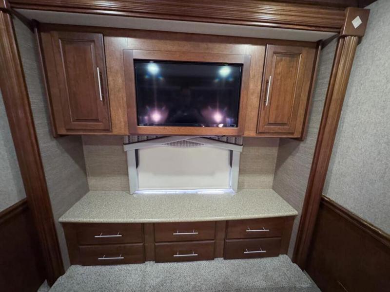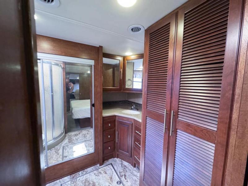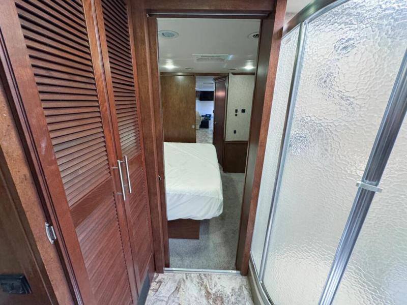 Head through the sliding doors to the rear private bedroom and master bath. The bedroom features a king bed slide with overhead storage. On the opposite side find a slide out dresser with TV and overhead cabinets.