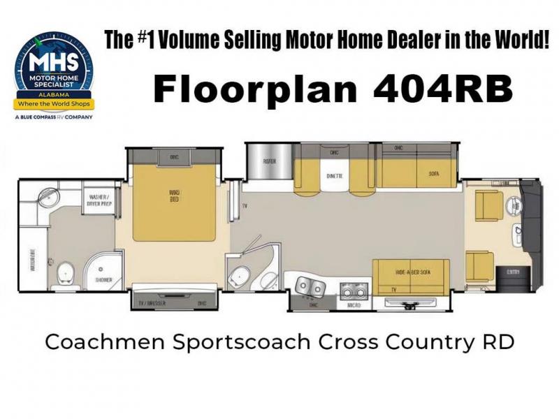 Step inside this Sporstcoach Cross Country RD class A rear diesel coach and feel like you are still at home! Model 404RB features a spacious rear bath, king size bed, and quadruple slides for added interior space, plus an additional half bath for convenience!