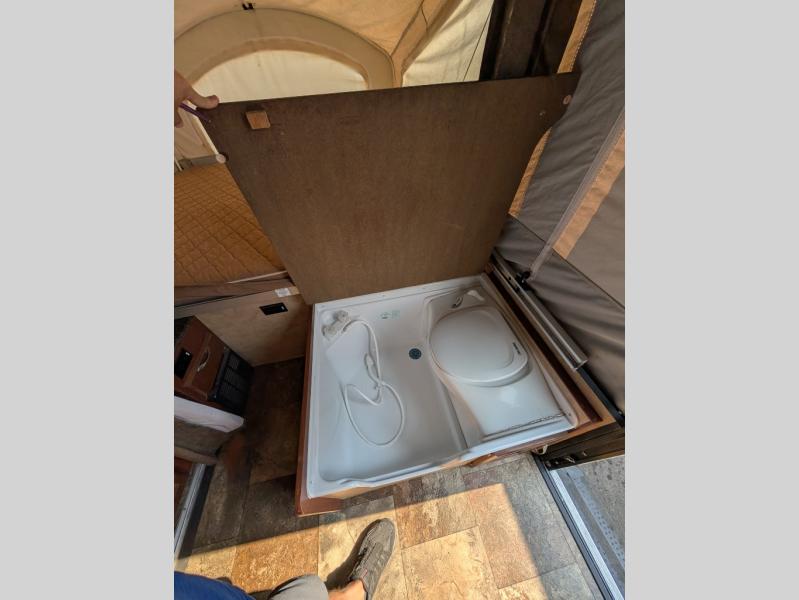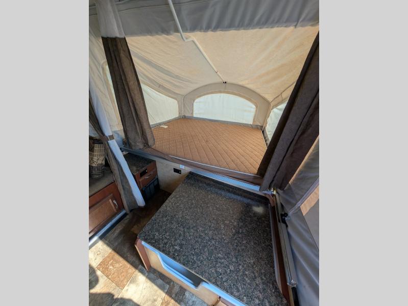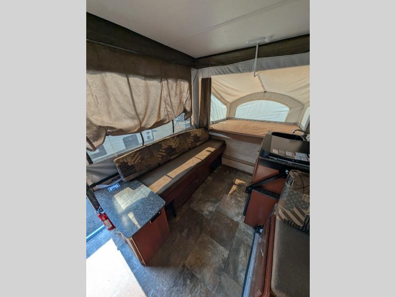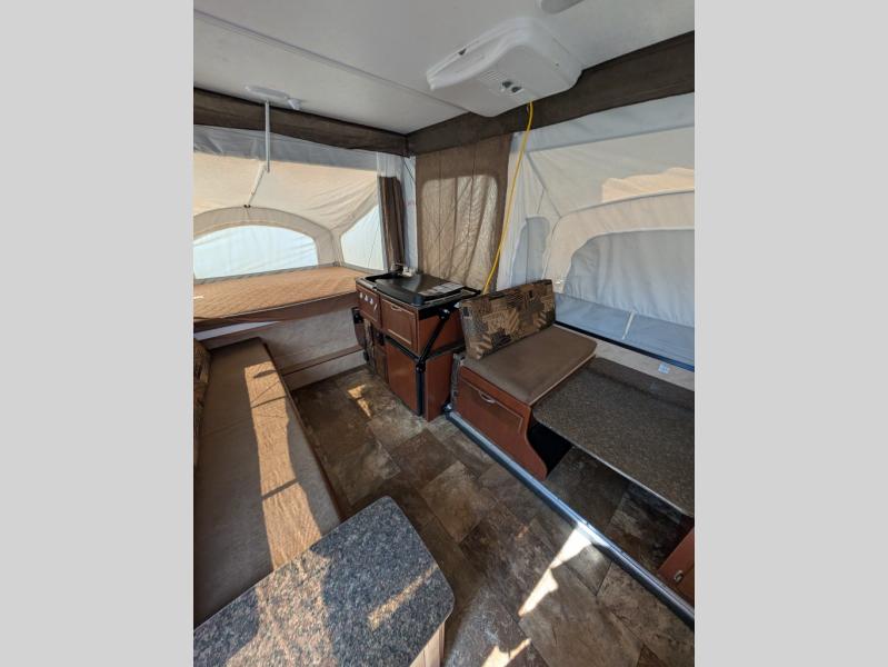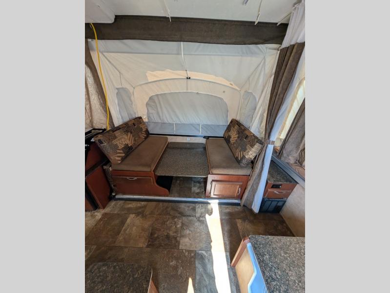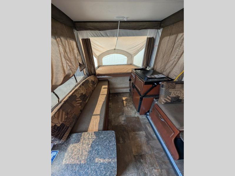 On the inside of this pop-up camper you will enjoy plenty of space with a slide out dinette and table that can be used inside or outdoors. There is lounge seating as well as plenty of storage in the provided cabinets, plus more storage under the dinette bench seats.