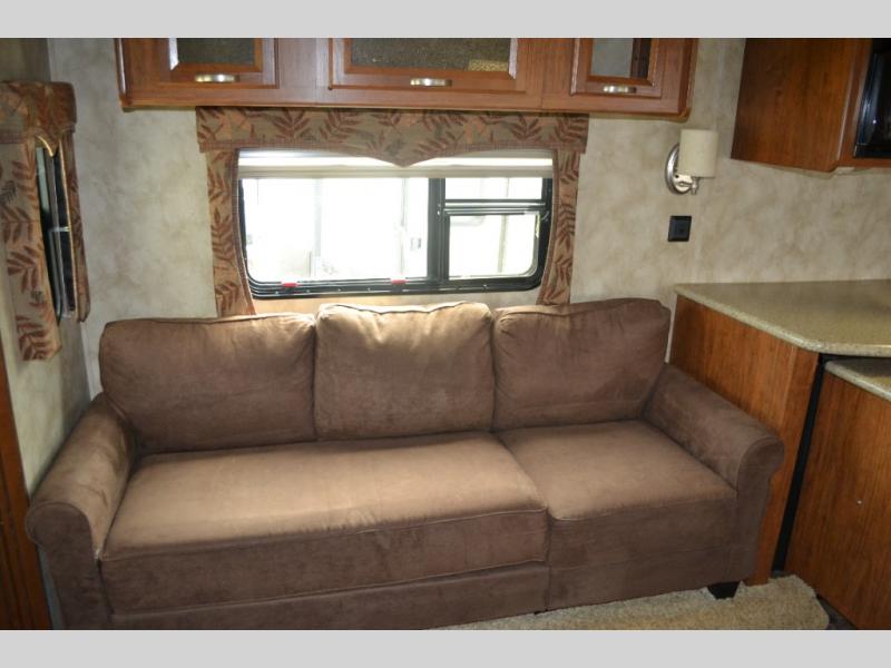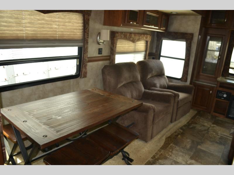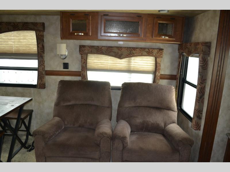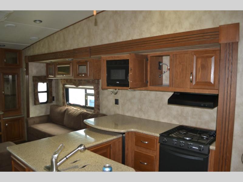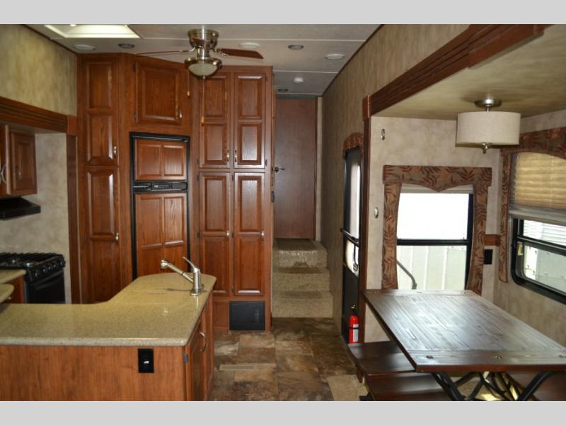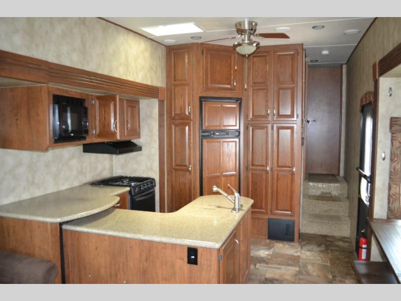 When you enter the fifth wheel, to the left there is a slide with a free-standing table and chairs, and two lounge chairs. Along the rear wall you will find an entertainment center. There is another slide on the other side of the fifth wheel with a l-sofa, and a l-shaped counter, three burner range, and microwave. The kitchen sink is located on the l-shaped counter. Next to the slide there is a refrigerator, and pantry.