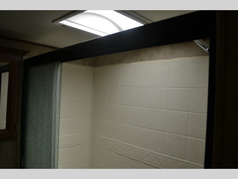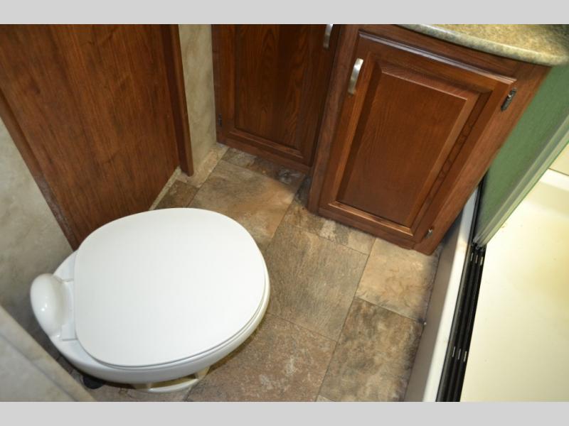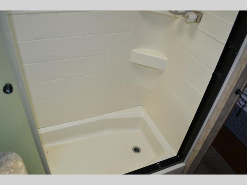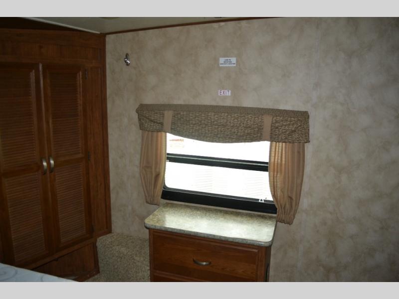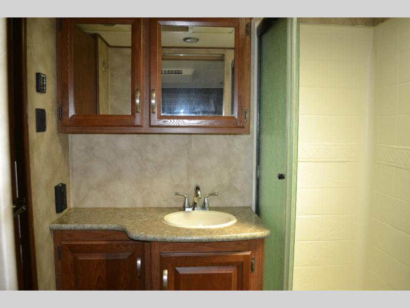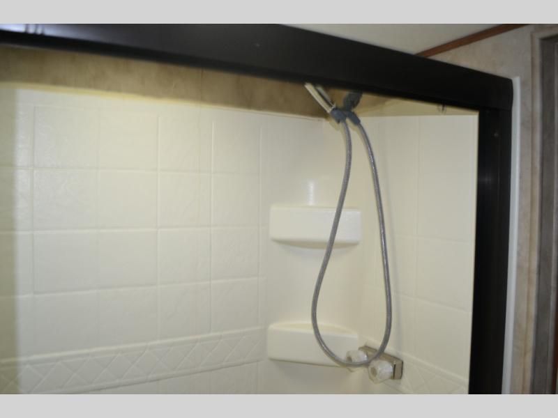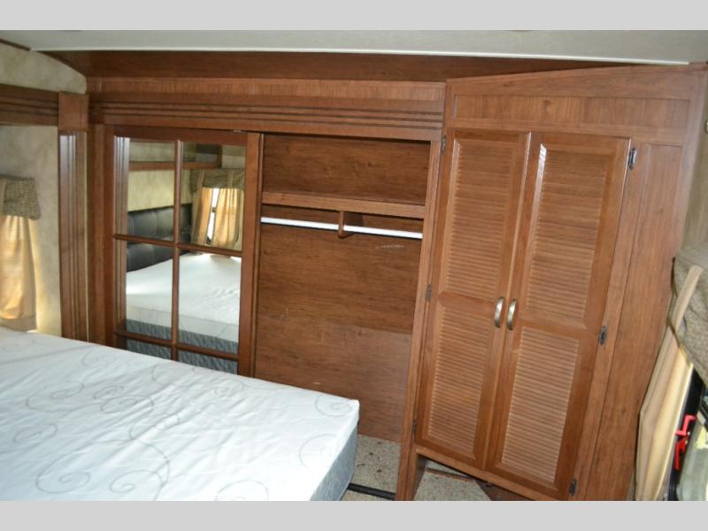 When you enter the fifth wheel, to the left there is a slide with a free-standing table and chairs, and two lounge chairs. Along the rear wall you will find an entertainment center. There is another slide on the other side of the fifth wheel with a l-sofa, and a l-shaped counter, three burner range, and microwave. The kitchen sink is located on the l-shaped counter. Next to the slide there is a refrigerator, and pantry.