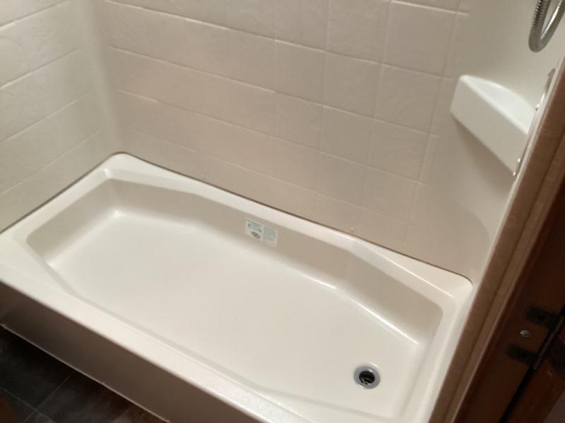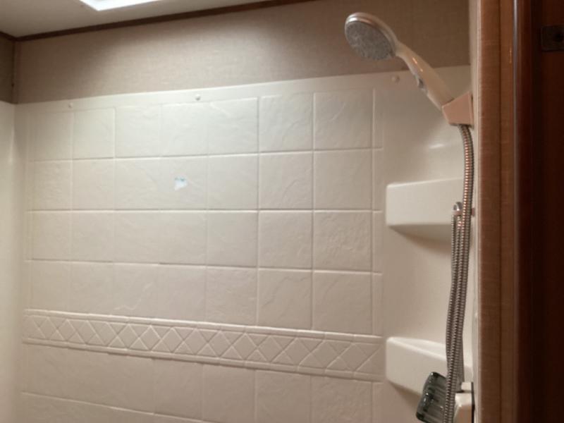 The rear bathroom is quite spacious and has a shower, sink, medicine cabinet, and toilet.