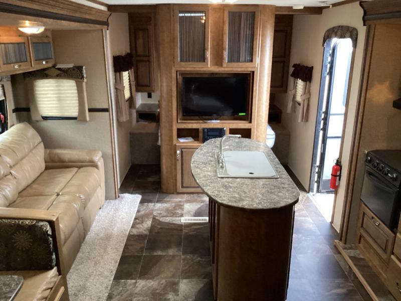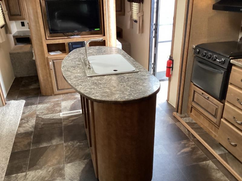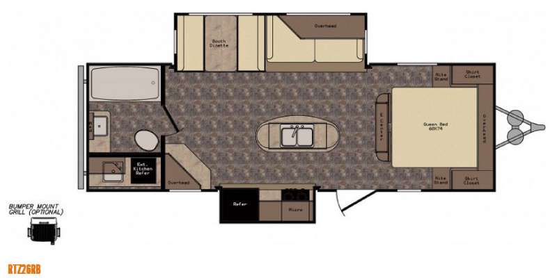 As you enter the RTZ26RB, to the left is a slide with a range, microwave, and refrigerator. The kitchen has a kitchen island and plenty of counter space surrounding the kitchen sink. On the opposite side of the fifth wheel, you will find a slide with a jack knife sofa and a booth dinette.