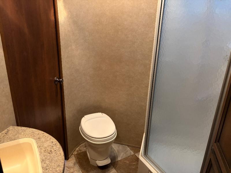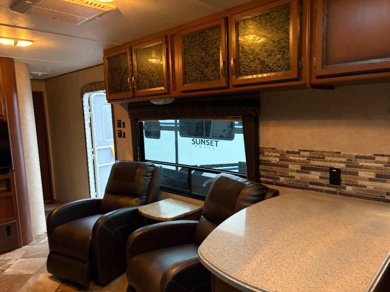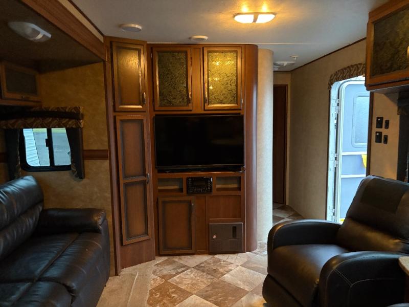 As you enter the travel trailer, to the left are two lounge chairs. The kitchen has a wrap around counter with extra counter space, a double kitchen sink, range, microwave, refrigerator, and pantry. The slide offers a booth dinette and a sofa. Along the front of the living area there is a closet and an entertainment center.