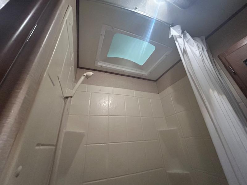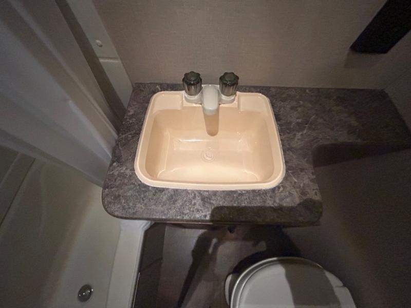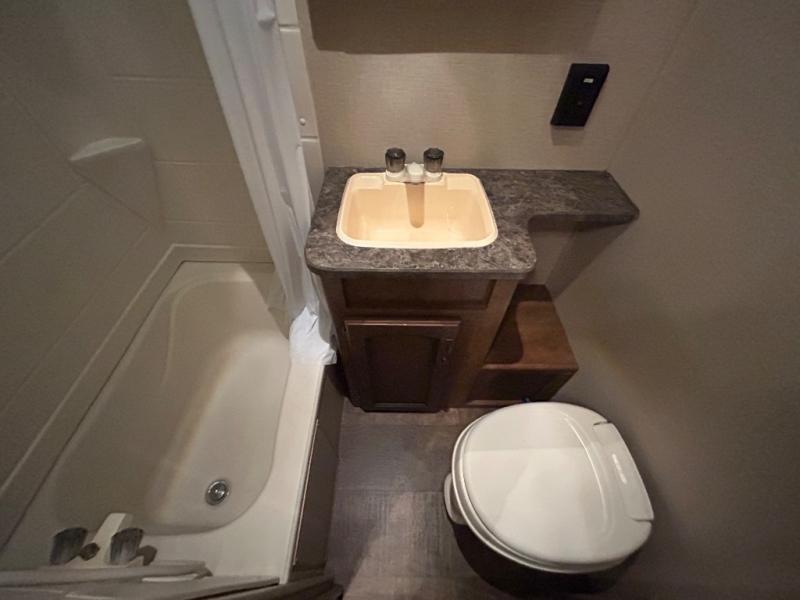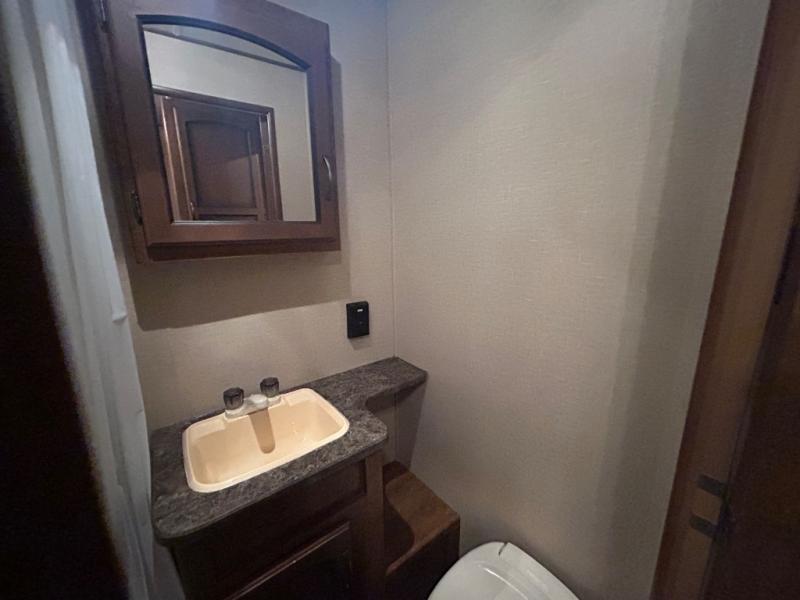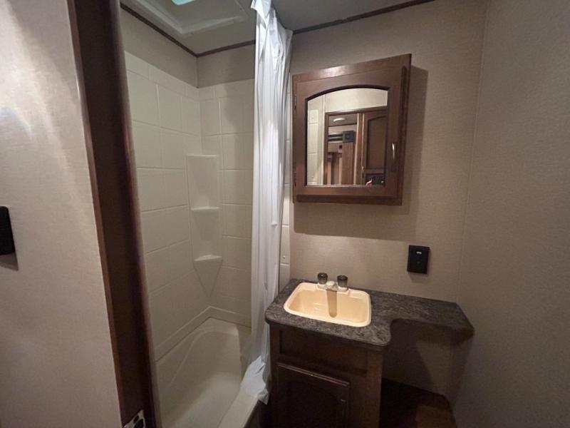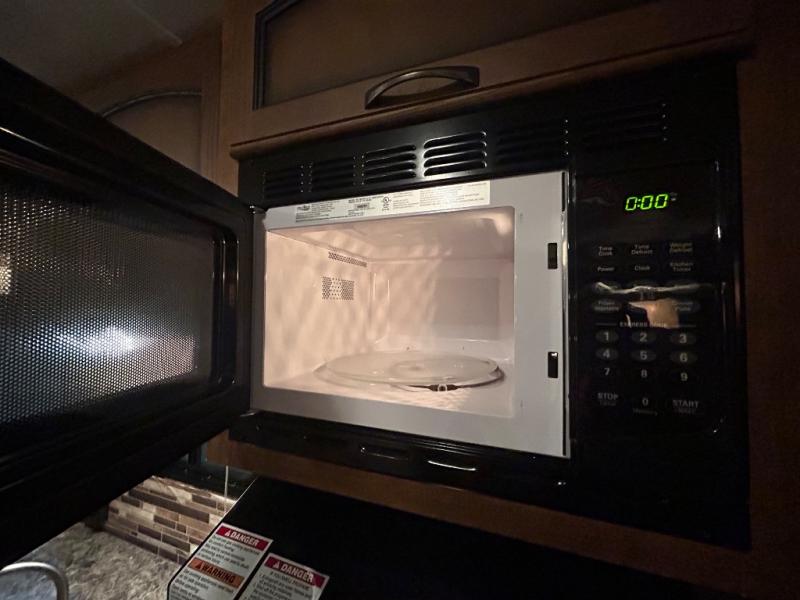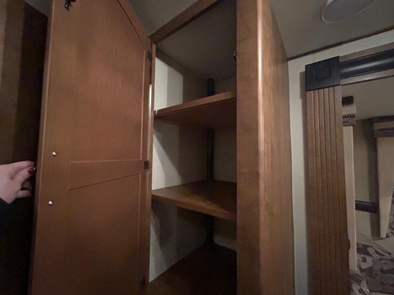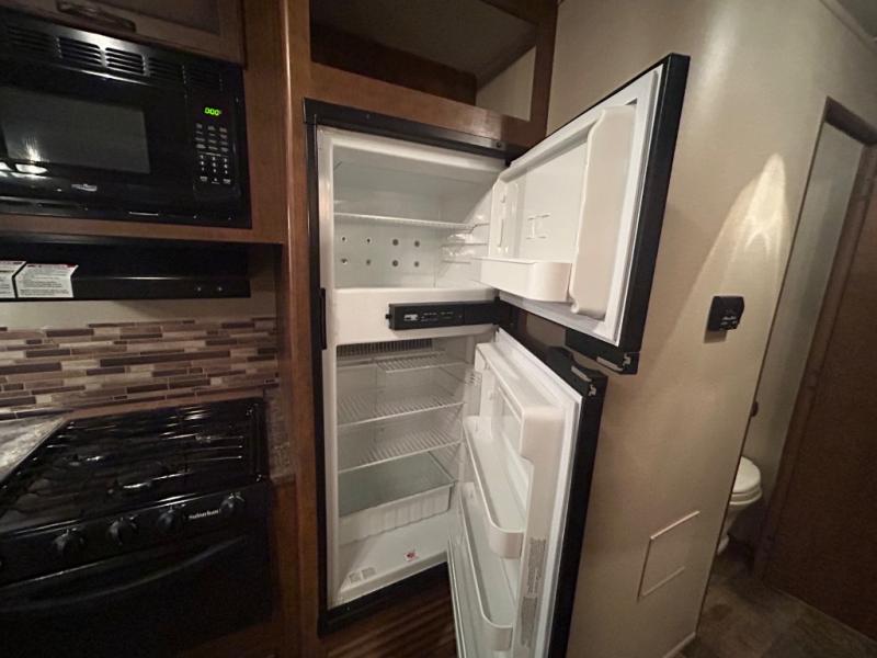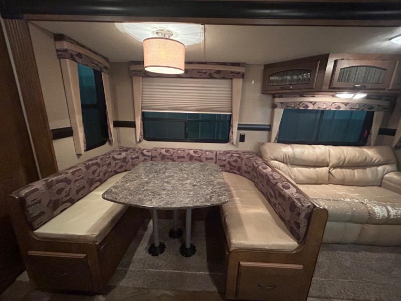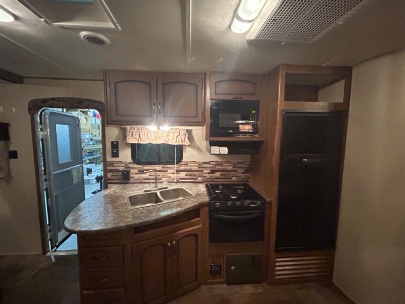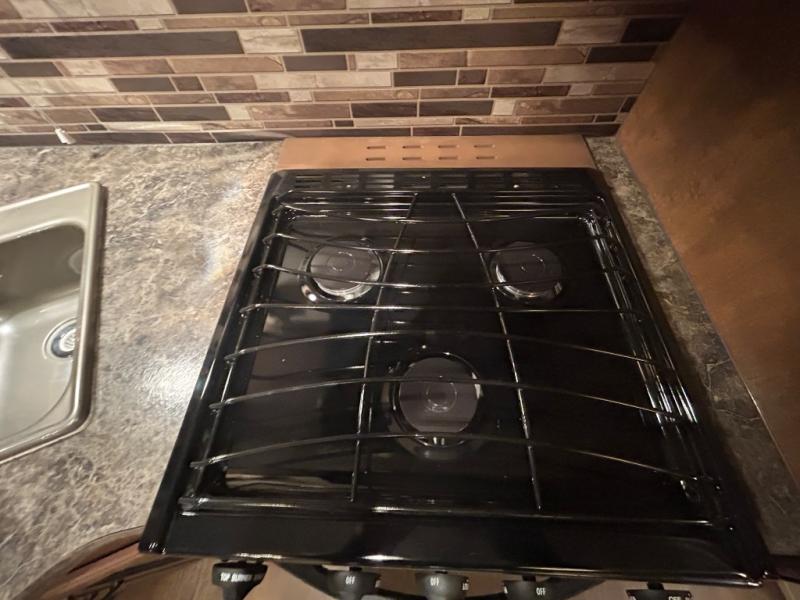 As you enter the travel trailer, to the left there is a double kitchen sink, three burner range, microwave, and refrigerator. On the opposite side of the trailer you will find a slide with a sofa and a u-shaped dinette. Next to the slide there is a large pantry which is ideal for your food items. Just before you enter into the front bedroom you will see an entertainment center.