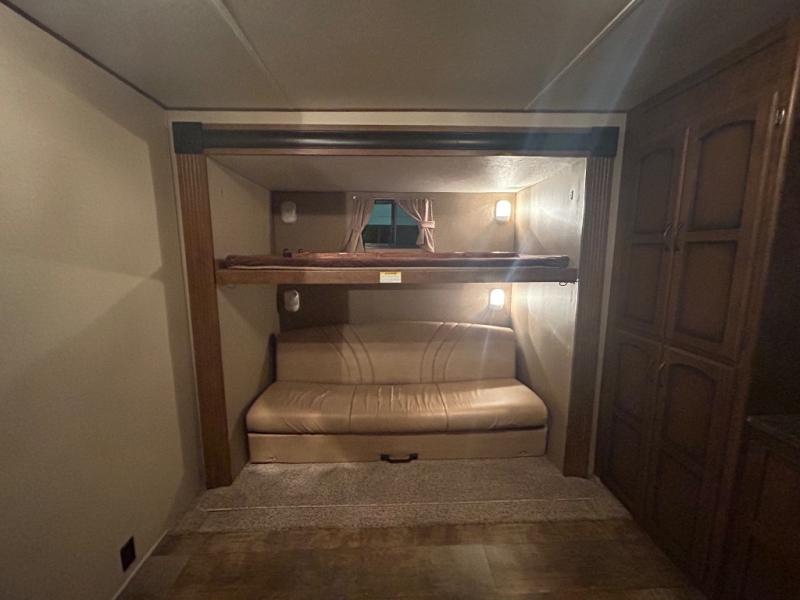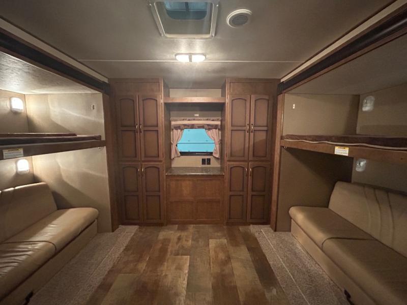 The rear bunk house features two slides, one on either side of the trailer. Each slide has a sofa on the bottom and a bunk above the sofa. Along the rear wall of the room there is a large wardrobe.