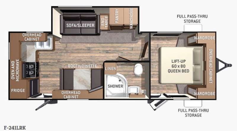 Enter model 241LRK via the rear most entrance and find yourself in the kitchen. The refrigerator is immediately to your left as you enter, next a three burner range with overhead microwave, counter space, and a double kitchen sink. There are also plenty of overhead cabinets, plus lower cupboards and drawers for all of your things.