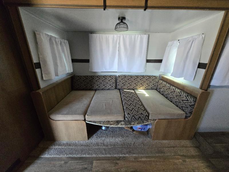 The slide out booth dinette provides plenty of seating for meal times and more. The slide makes the interior a little more spacious by opening up the walking space that leads to the front queen bed area.