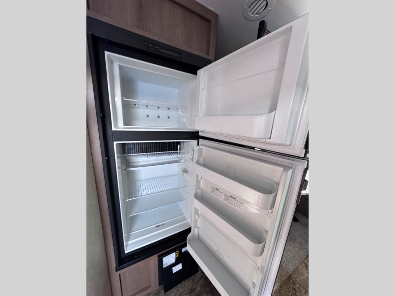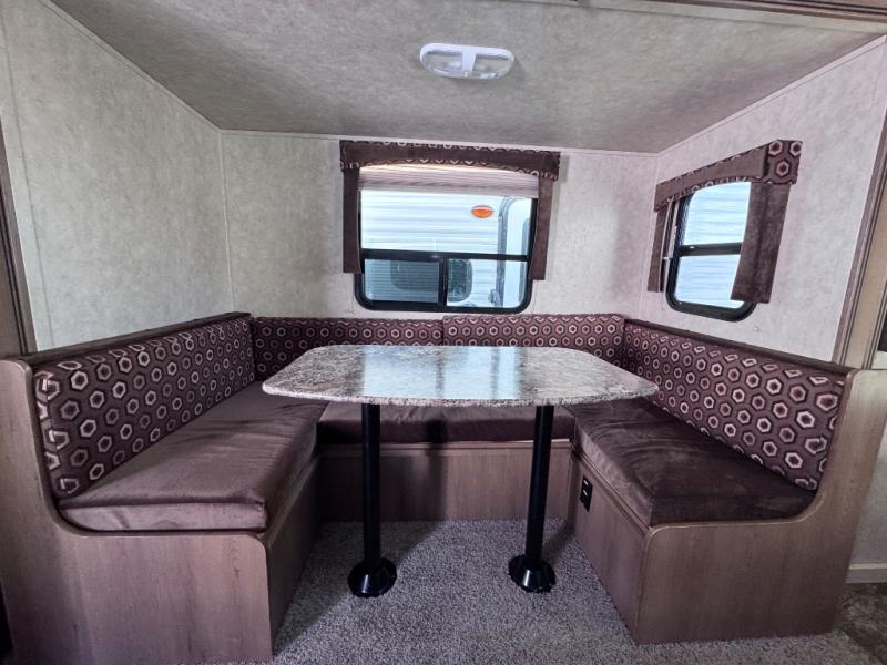 The slide out booth dinette provides plenty of seating for meal times and more. The slide makes the interior a little more spacious by opening up the walking space that leads to the front queen bed area.