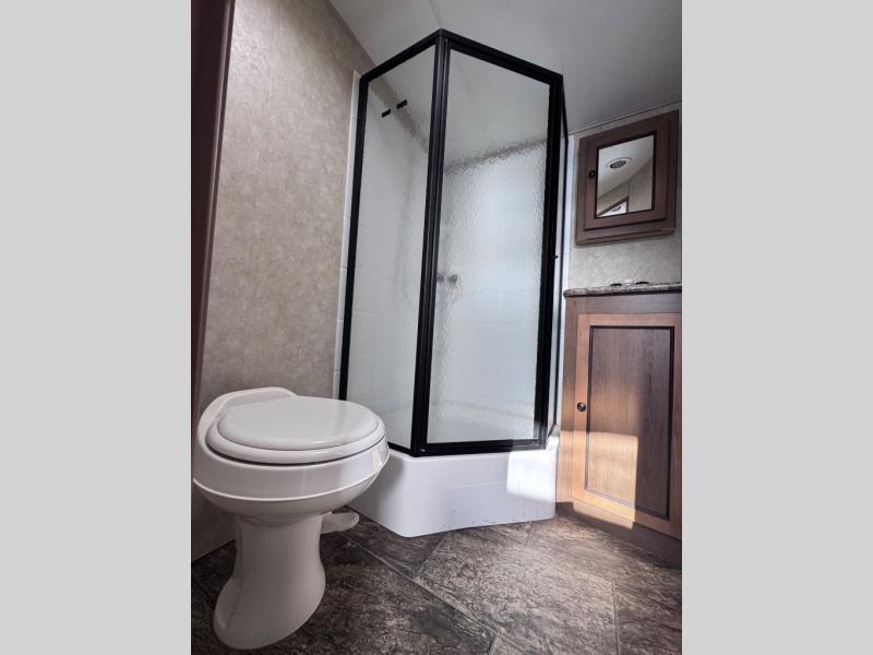 Stepping inside this unit you will find a closet/pantry to your immediate left. There is a bath straight ahead which features an angled shower, toilet, sink, and skylight.