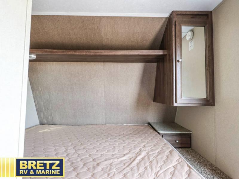 Step inside and see a queen size bed along the front of this unit with a large storage shelf that stretches across the front side. There is a nightstand and shirt closet just off the foot of the bed to the right of the main entry door.