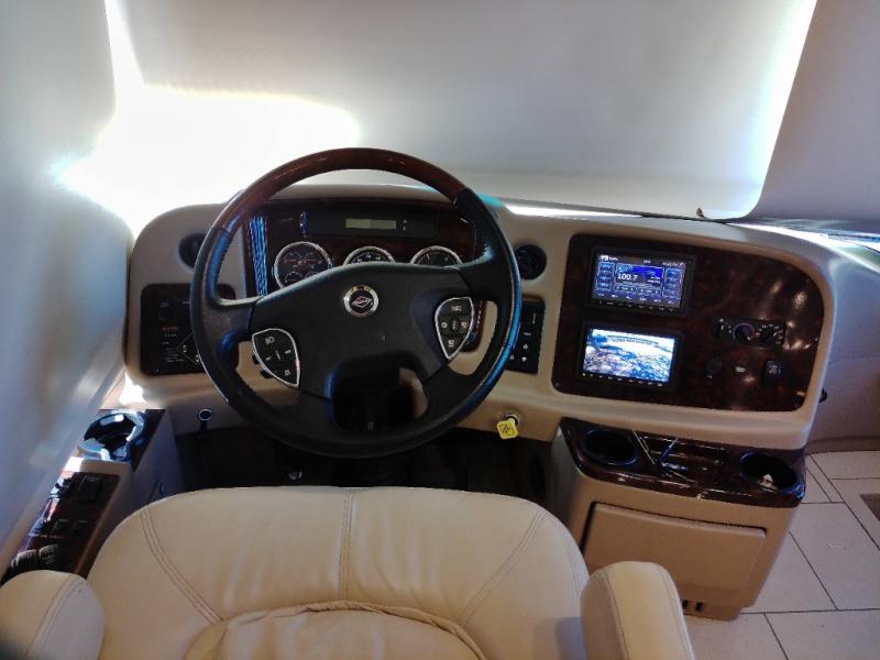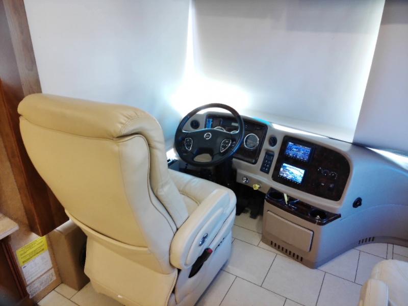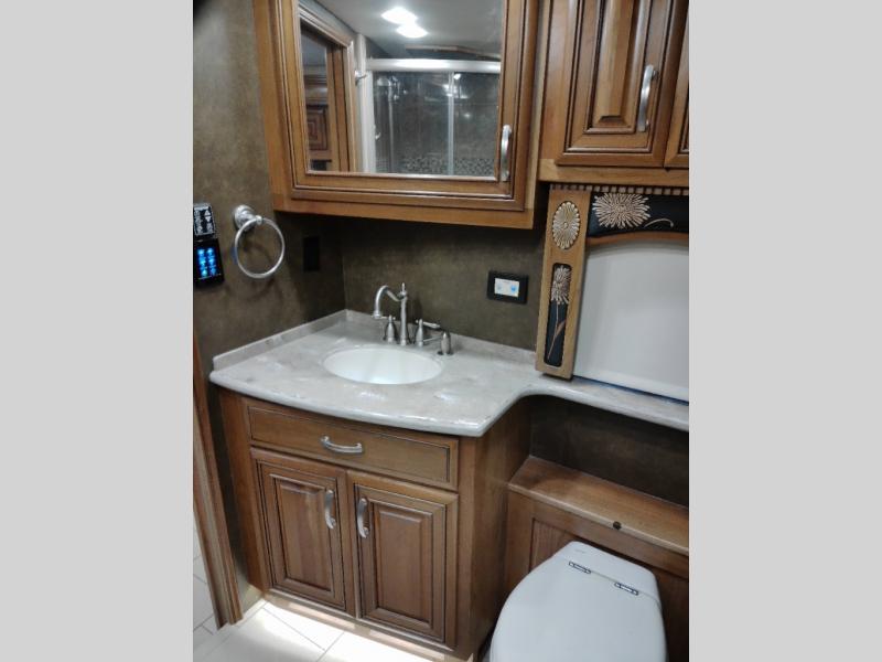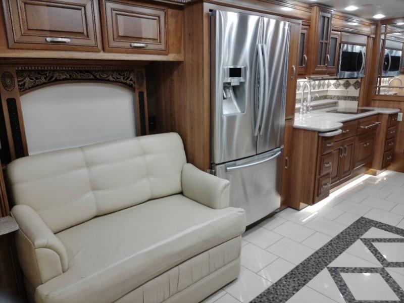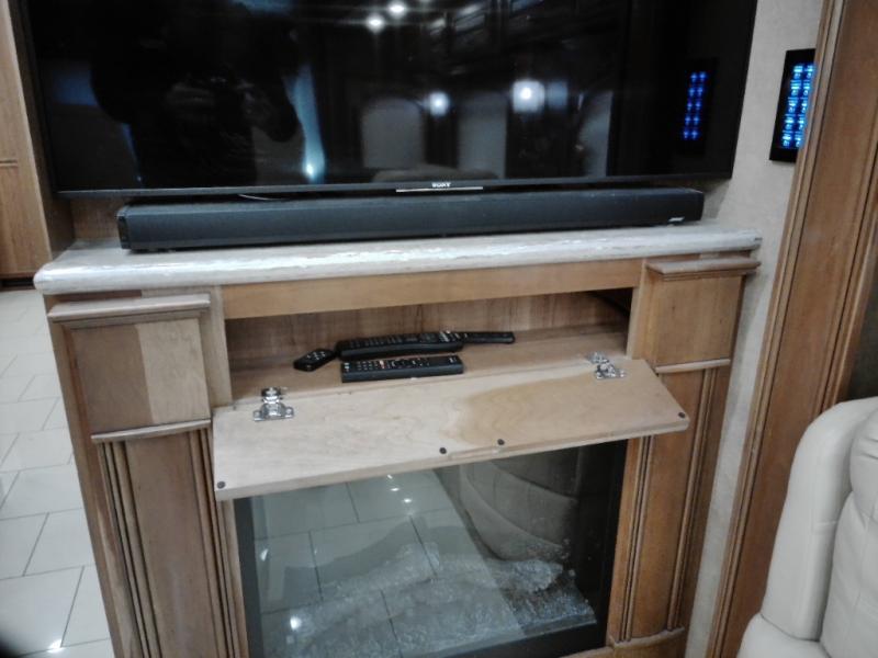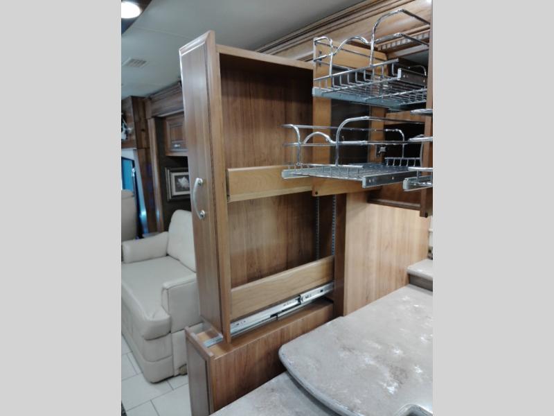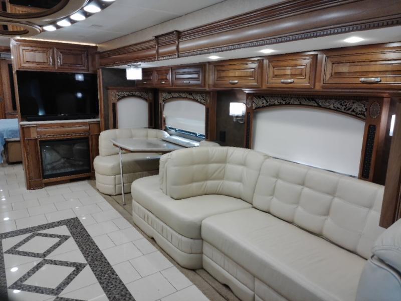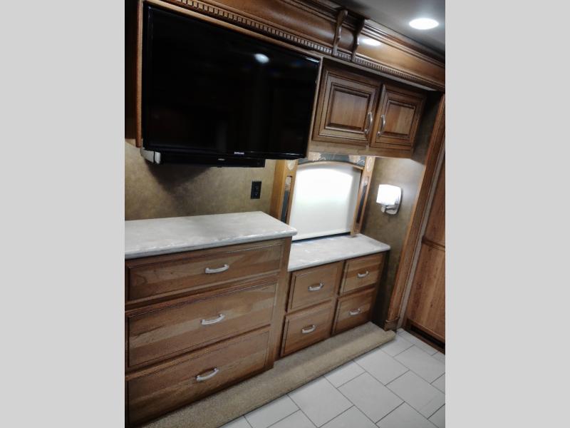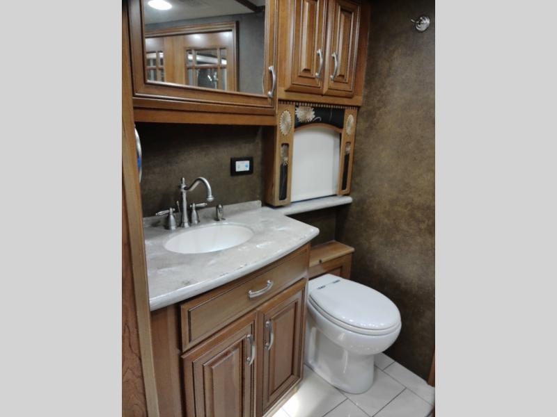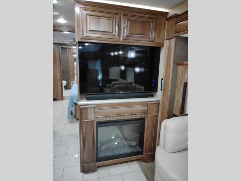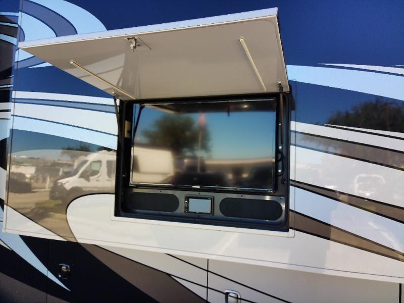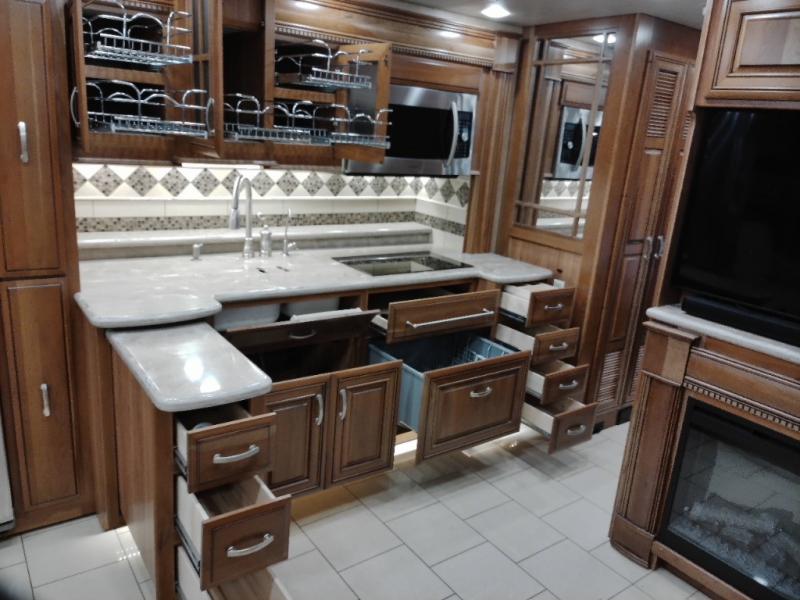 Stepping inside the motor home, along the passenger side there is a slide with a hide-a-bed sofa or an optional easy bed sofa with table, refrigerator, pantry, double kitchen sink, and two burner range. Next to the slide you will find a washer and dryer. The opposite side of the motor home has a slide with a sofa and dinette ensemble, or you can choose an optional hide-a-bed and free-standing table with chairs. There is an entertainment center with a fireplace and a 46" LED TV. Above the driver and passenger seat you will find a 32" LED TV