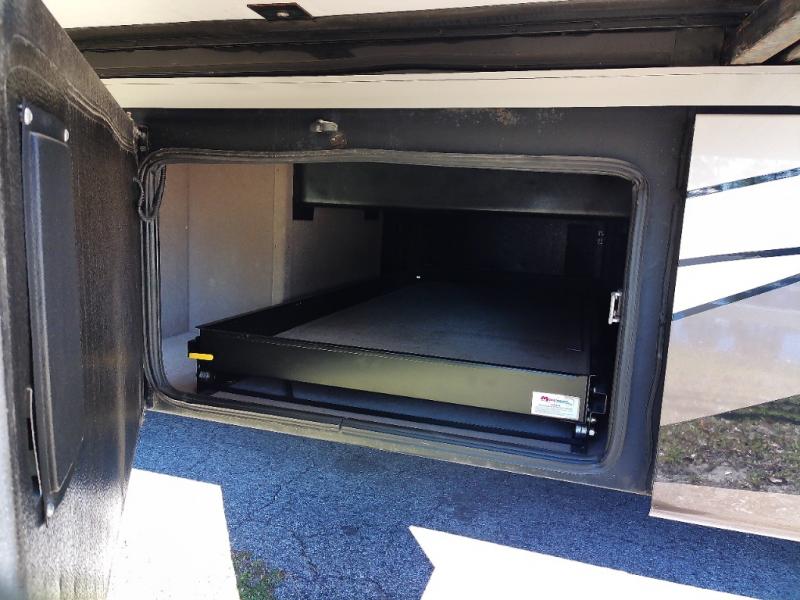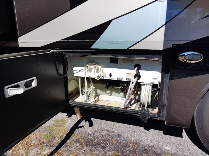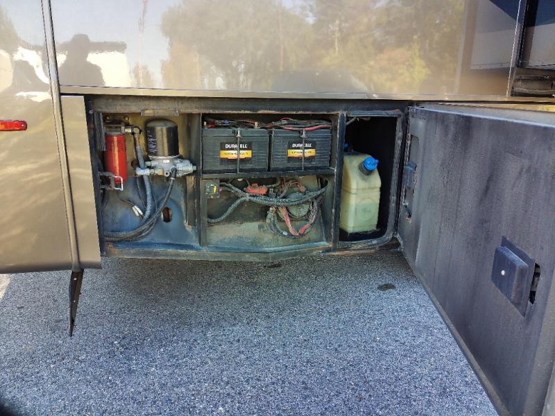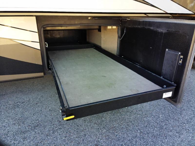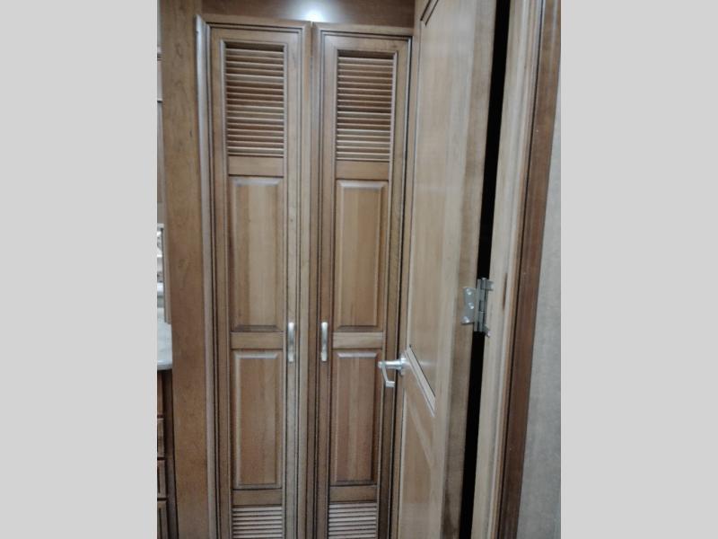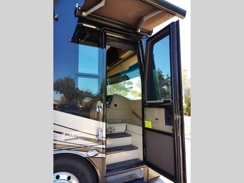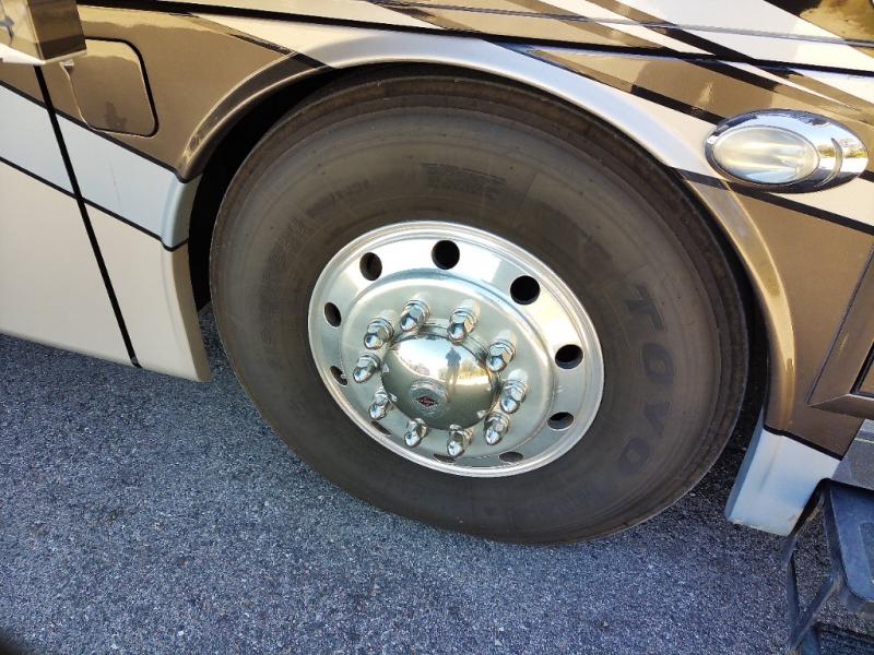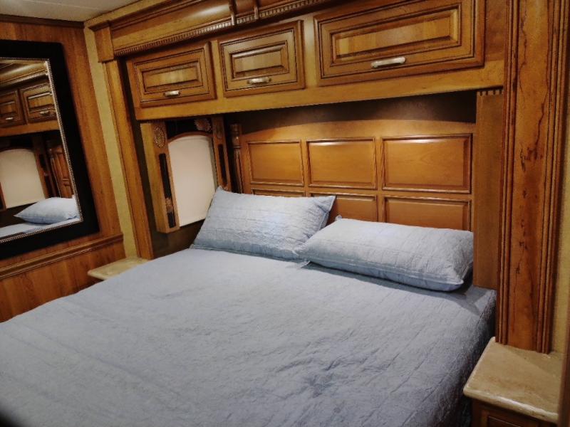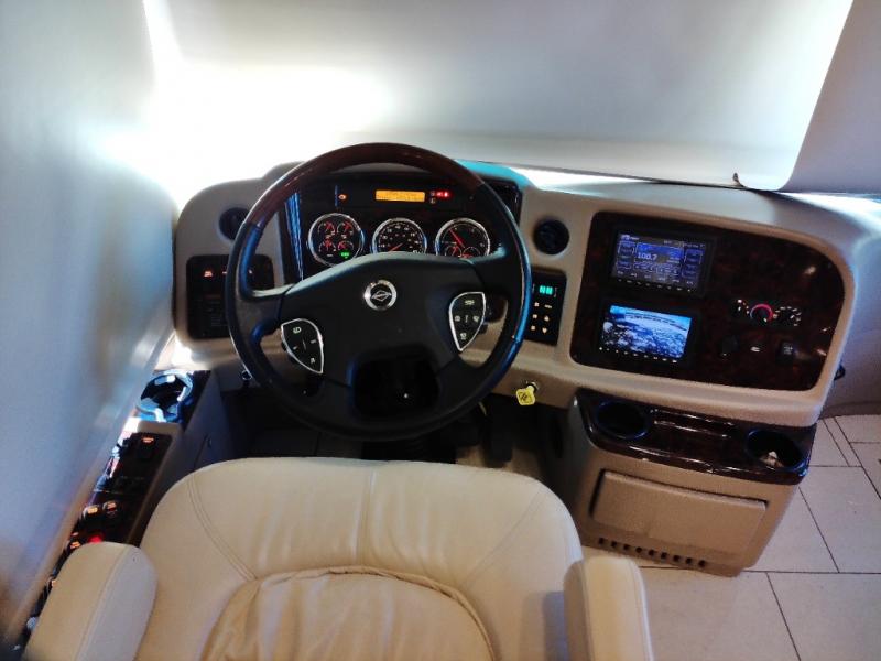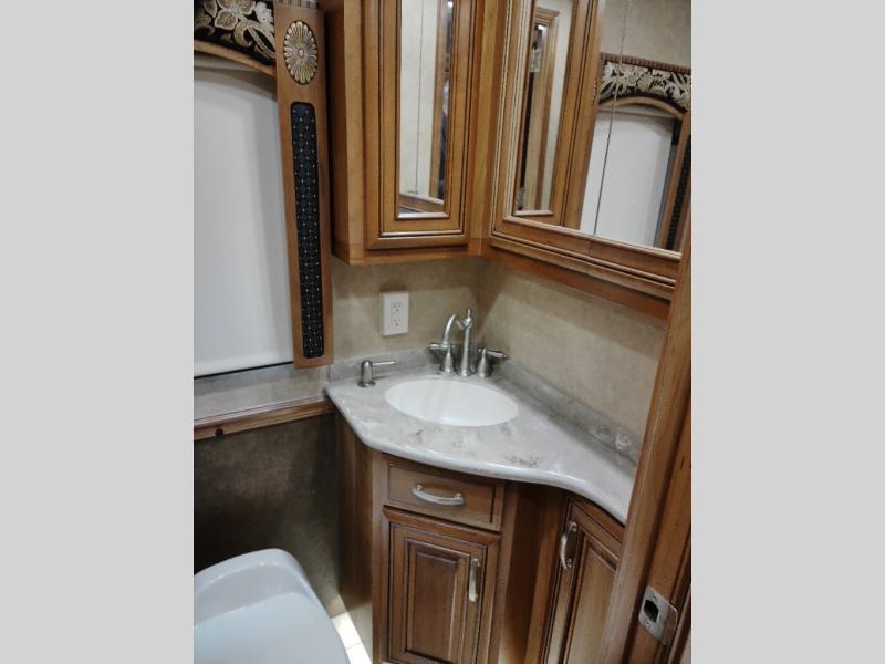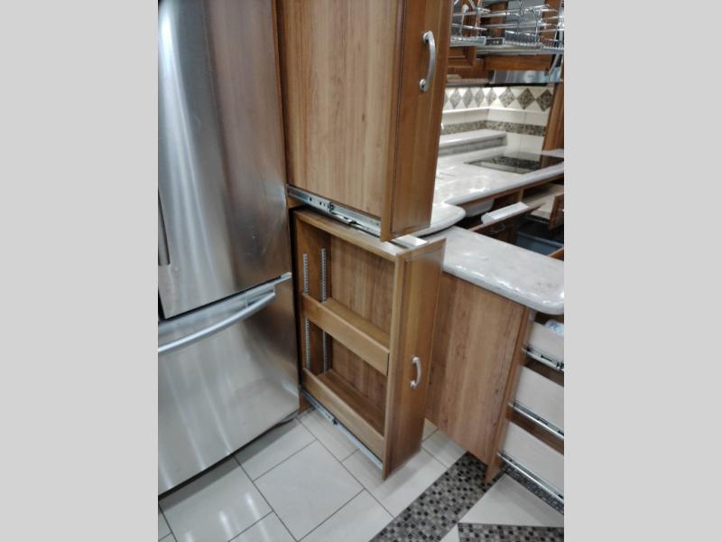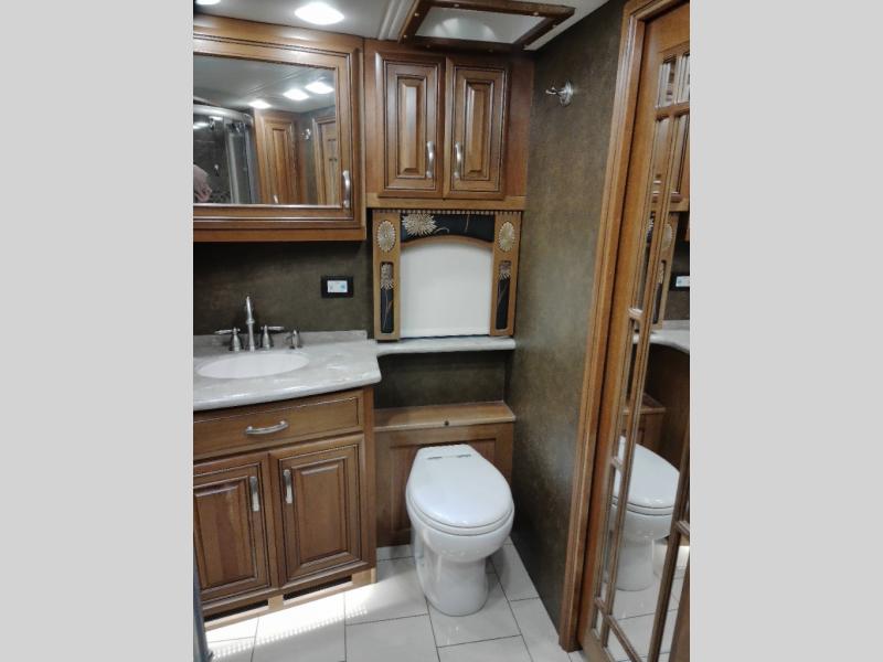 Stepping inside the motor home, along the passenger side there is a slide with a hide-a-bed sofa or an optional easy bed sofa with table, refrigerator, pantry, double kitchen sink, and two burner range. Next to the slide you will find a washer and dryer. The opposite side of the motor home has a slide with a sofa and dinette ensemble, or you can choose an optional hide-a-bed and free-standing table with chairs. There is an entertainment center with a fireplace and a 46" LED TV. Above the driver and passenger seat you will find a 32" LED TV