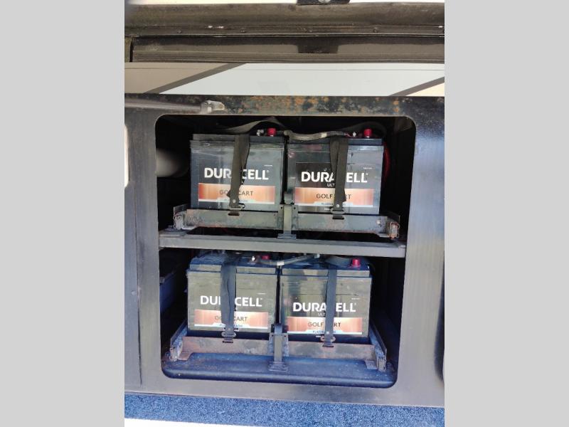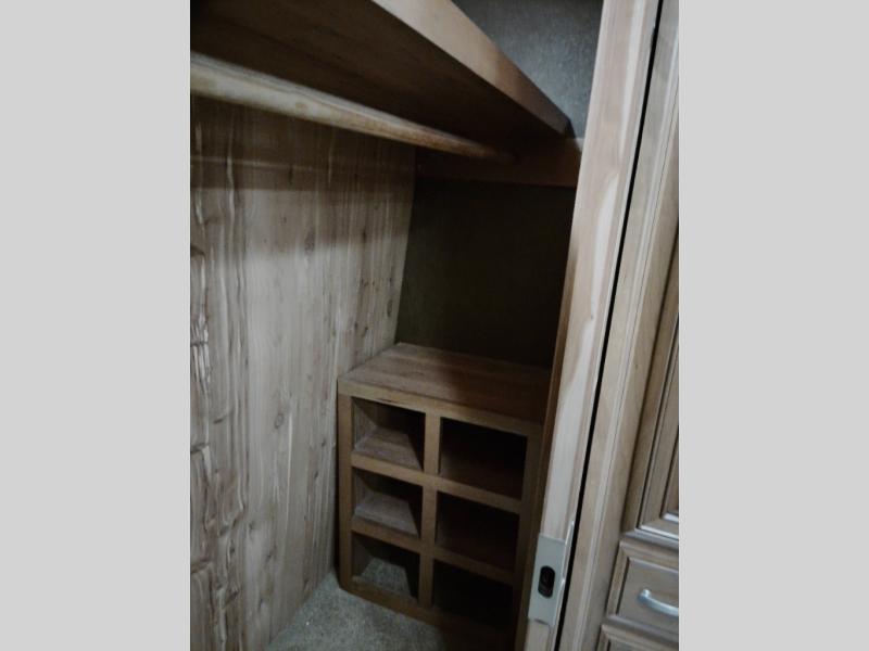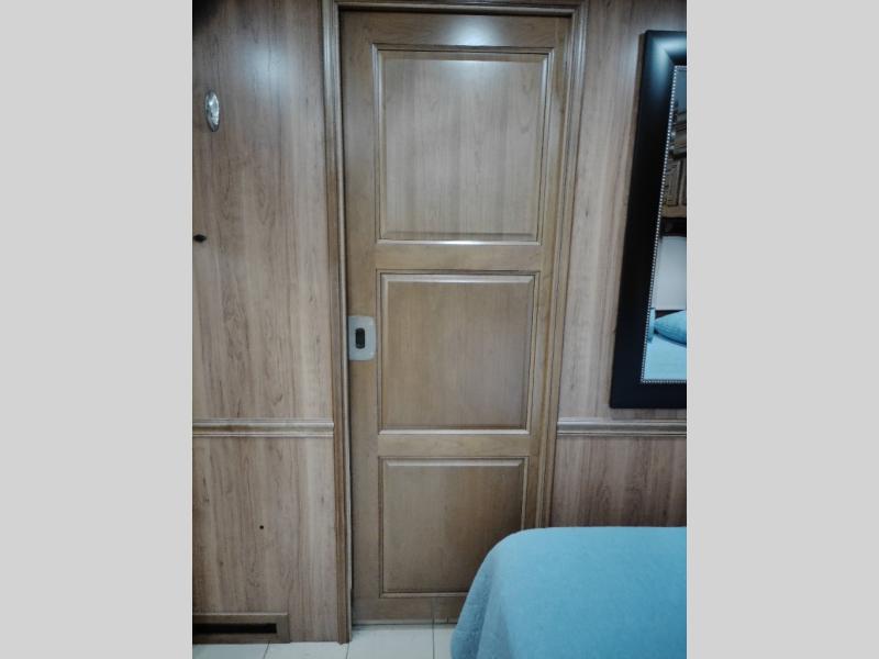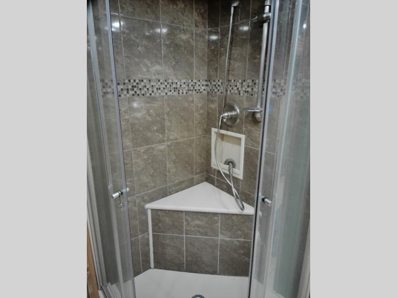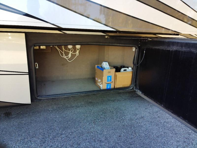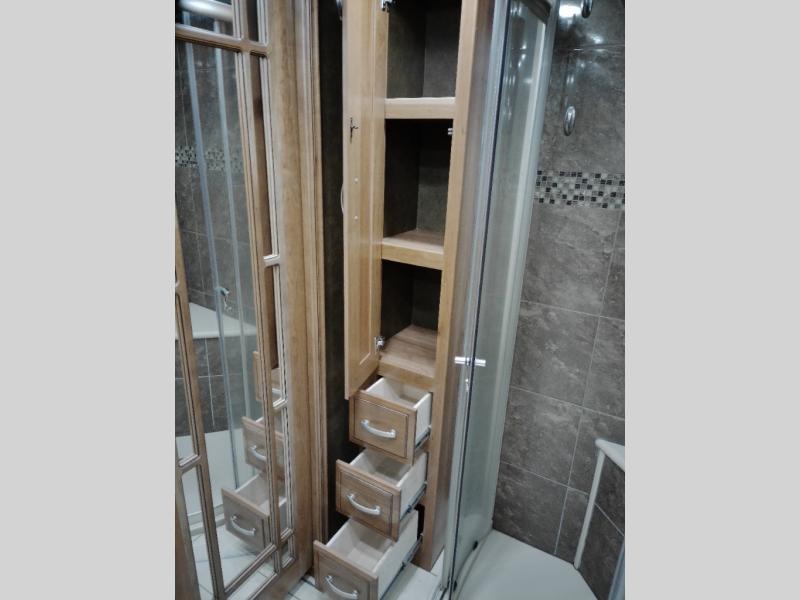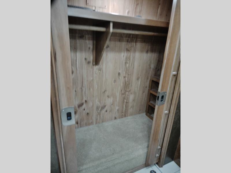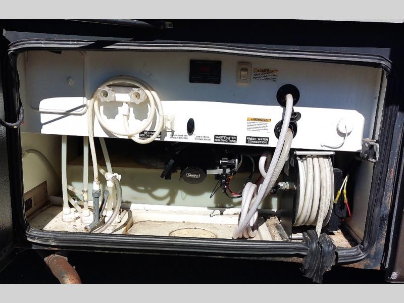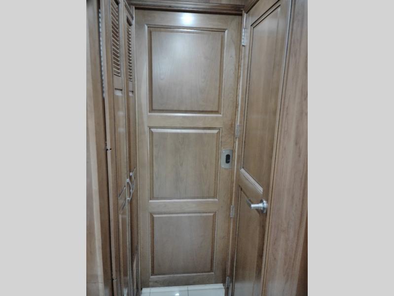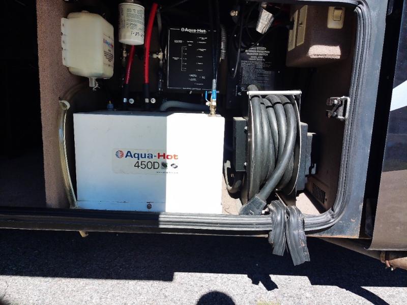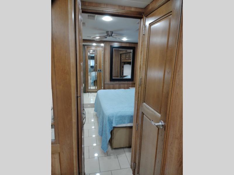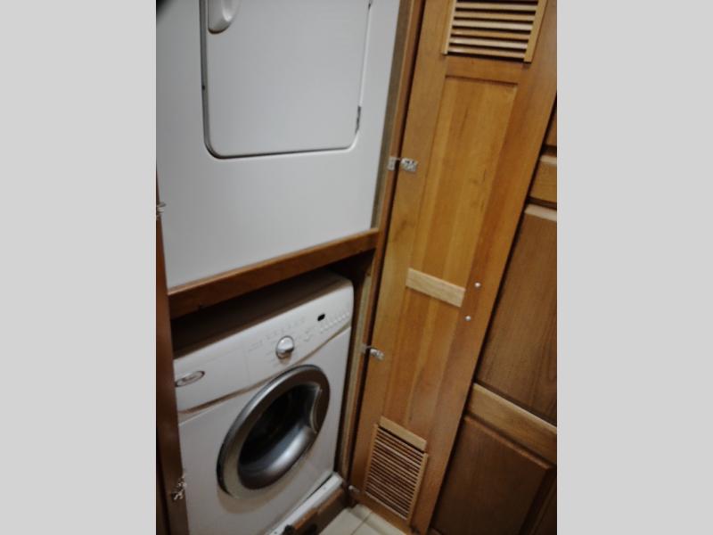 Stepping inside the motor home, along the passenger side there is a slide with a hide-a-bed sofa or an optional easy bed sofa with table, refrigerator, pantry, double kitchen sink, and two burner range. Next to the slide you will find a washer and dryer. The opposite side of the motor home has a slide with a sofa and dinette ensemble, or you can choose an optional hide-a-bed and free-standing table with chairs. There is an entertainment center with a fireplace and a 46" LED TV. Above the driver and passenger seat you will find a 32" LED TV