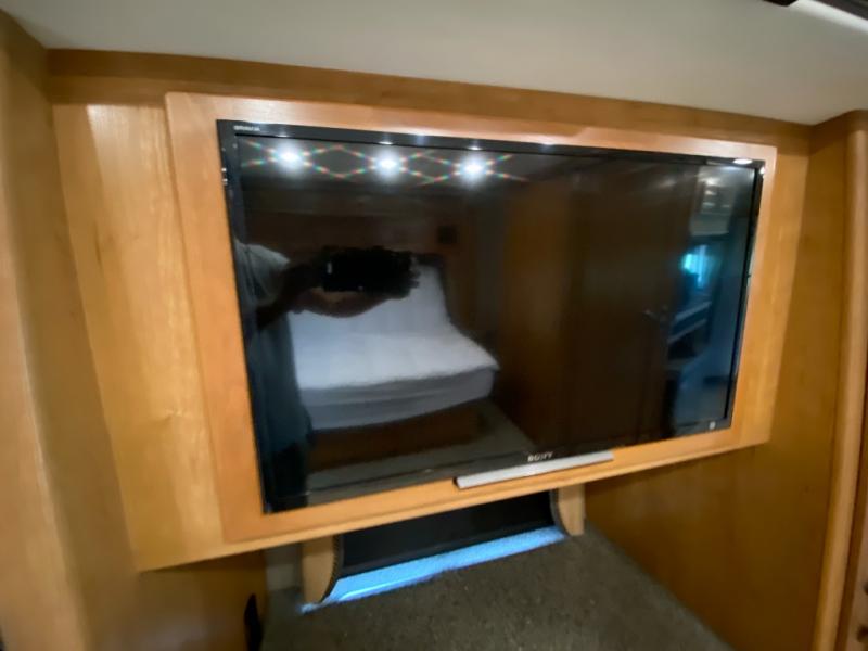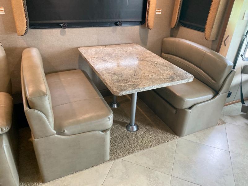As you enter the motor home, on the passenger side you will find a slide with a double kitchen sink, three burner range, microwave, refrigerator, and pantry. Next to the pantry there is a 40" LED TV for your enjoyment. The opposite side of the motor home offers a full wall slide with a free-standing dinette or an optional u-dinette, l-transformer sofa, storage cabinet, and wardrobes. There is even a 32" LED TV above the wardrobe.