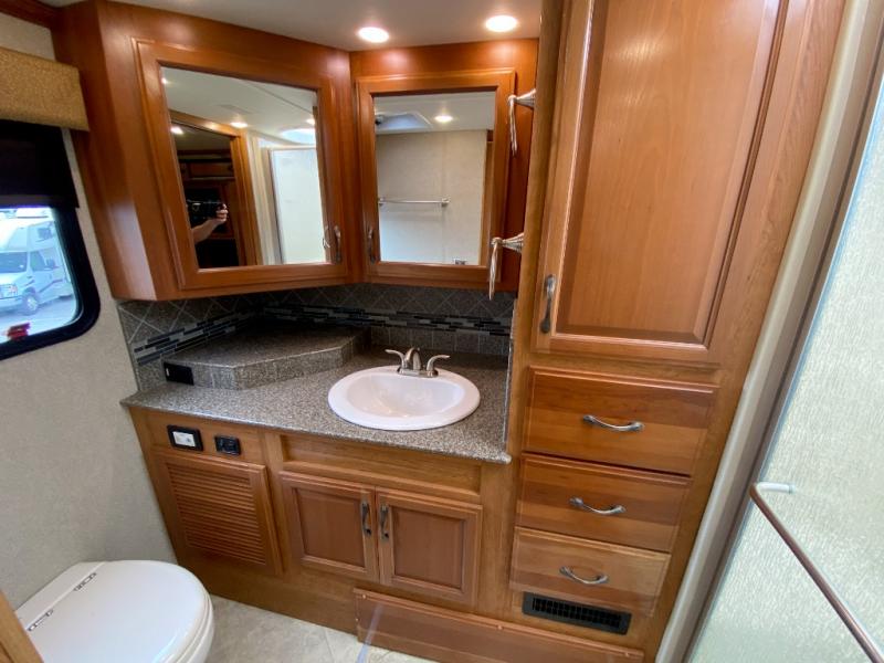 In the bedroom across from the wardrobes you will find a king bed with memory foam slide, or you can choose an optional king bed with air mattress. In the very rear of the motor home there is a nice size bathroom with a toilet, sink, linen cabinet, and shower with seat. As you leave the bedroom and proceed toward the front of the motor home you will find a convenient half bath.