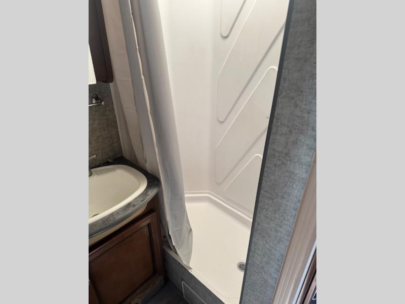 The bathroom is on the left as you proceed toward the back of the motor home. In the bathroom you will find a toilet sink, and shower. Just outside of the bathroom is a handy pantry. The bedroom offers a much space with a queen size bed and double wardrobes.