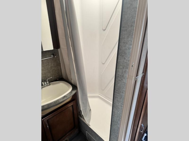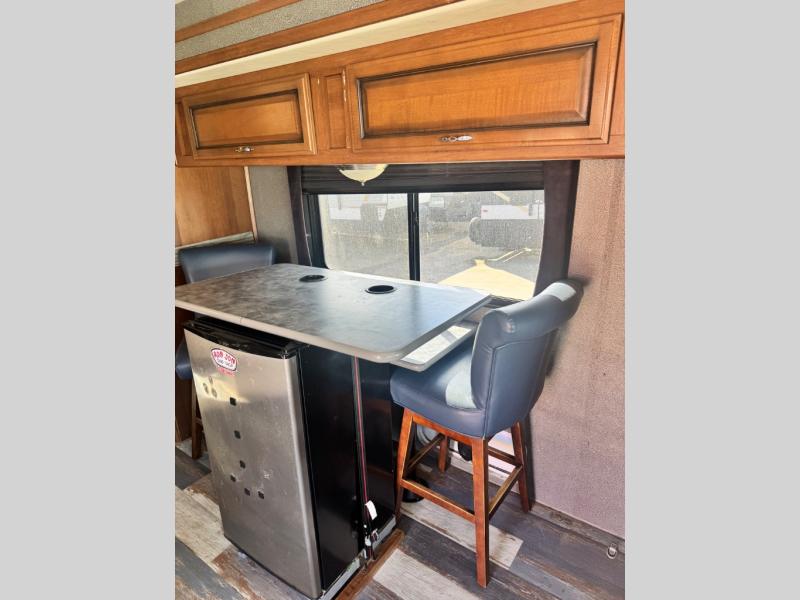 As you enter the 28MS Storm Fleetwood motor home, you will find a double kitchen sink, three burner range, and microwave to your left. The opposite wall has a u-shaped dinette, refrigerator, wardrobe and pantry slide. There is an overhead 32" LED TV, which you can enjoy from anywhere in the front of the motor home.