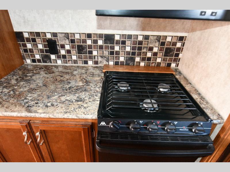 Three-burner range and refrigerator conveniently located in the kitchen slide
