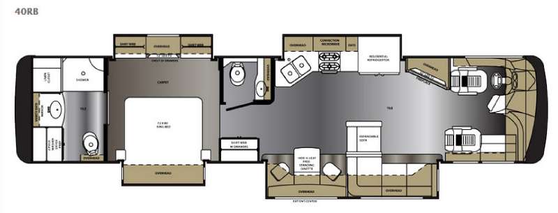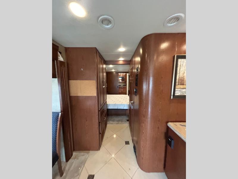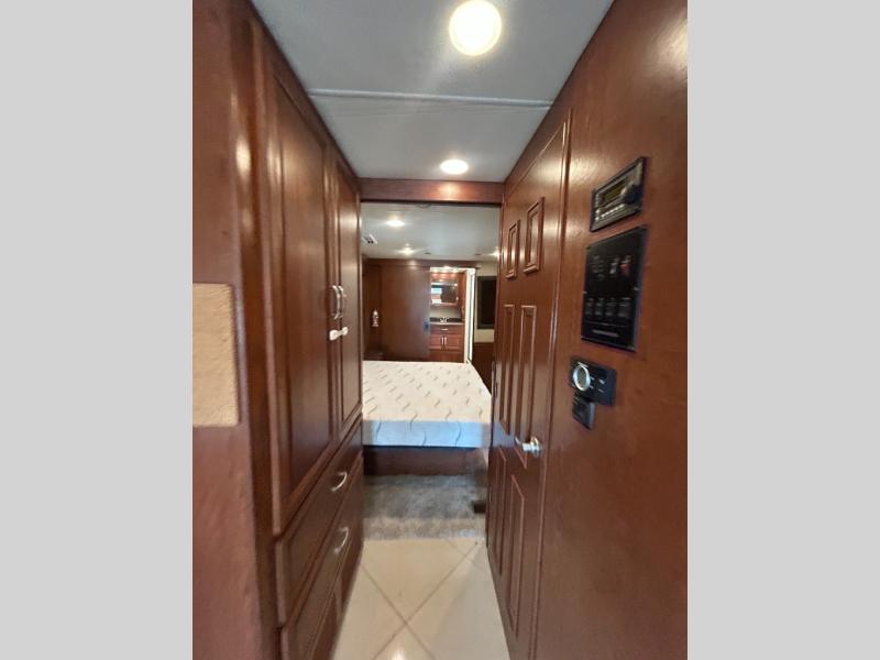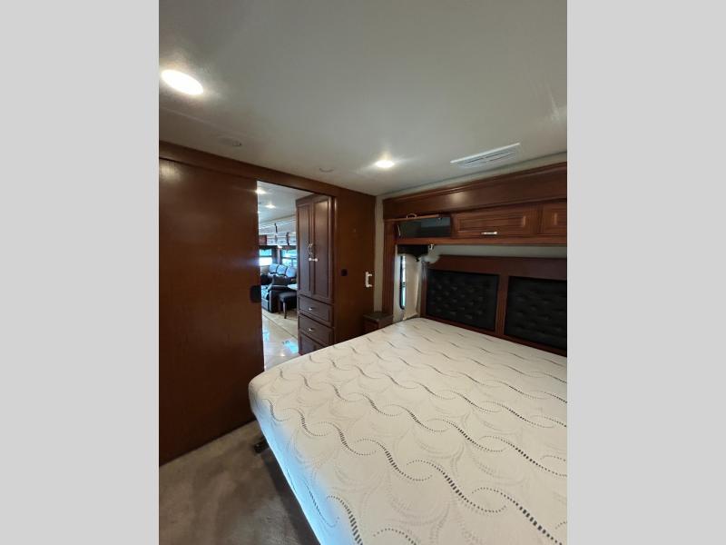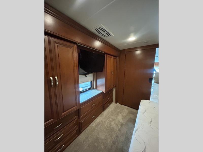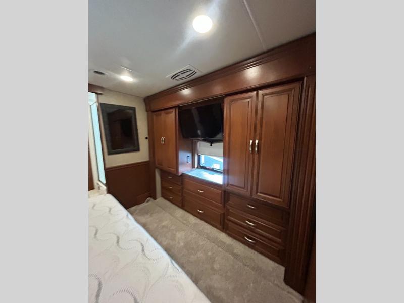 As you enter into the bedroom you will notice two slides. The first slide has a king bed with overhead cabinets above the bed. Across from the bed there is a slide with two shirt wardrobes, a chest of drawer, and a TV.