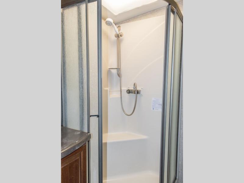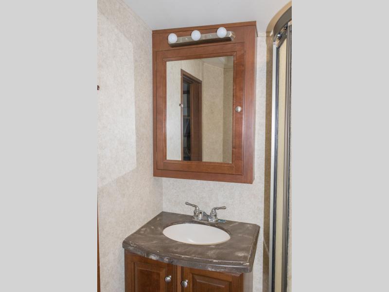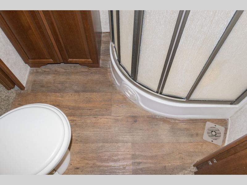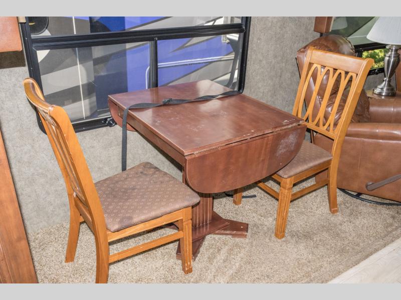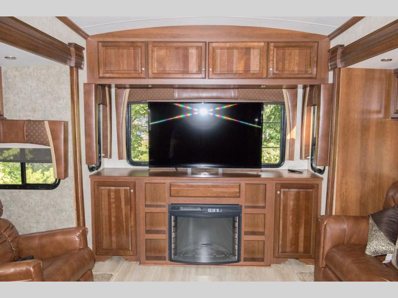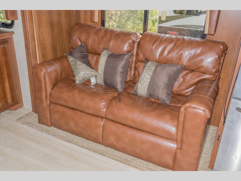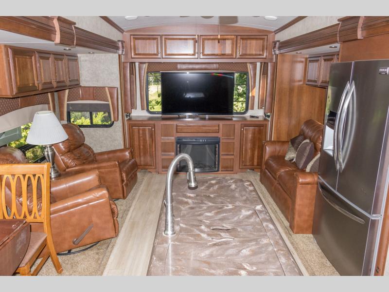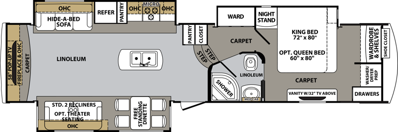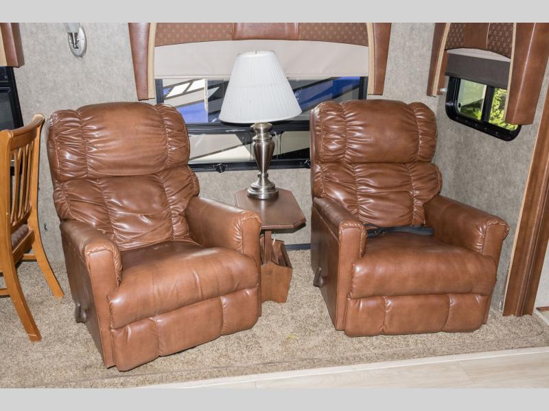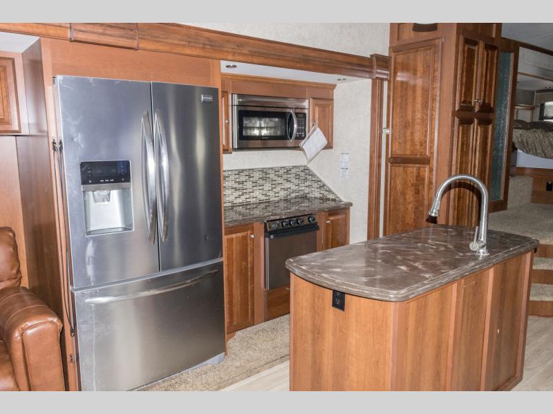 There are two slides in the rear of the fifth wheel. The first slide has a free standing dinette, two recliners or you can choose optional theater seating. Along the rear wall there is a 58" pop-up TV and fireplace. The other slide has a hide-a-bed sofa, refrigerator, pantry, microwave, and three burner range. The kitchen also has a kitchen island with a double kitchen sink. Just before you head upstairs, you will notice the additional pantry and closet.