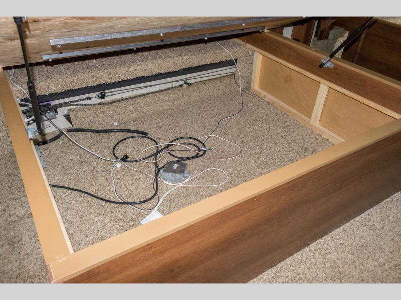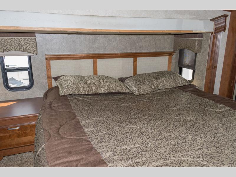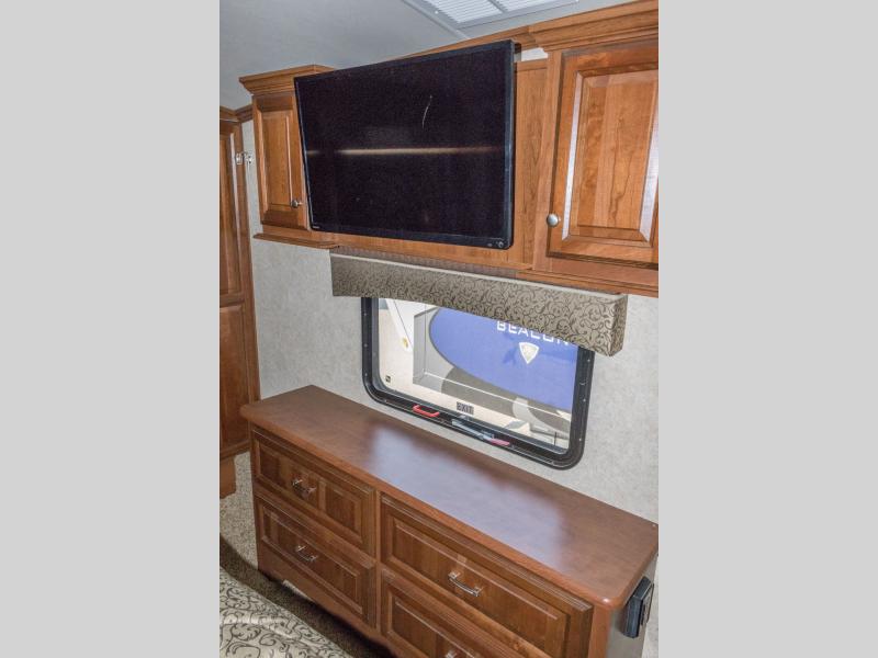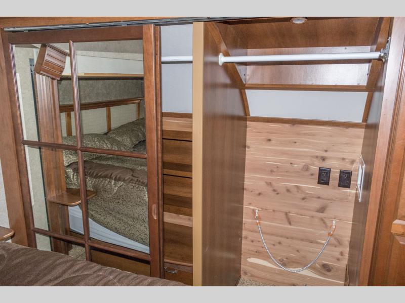 Inside the bedroom there is a slide with a wardrobe, nightstand, and king bed or you can choose an optional queen bed. Across from the bed there is a vanity with a 32" TV above the vanity. Along the front of the room you will find a wardrobe with shelves, and a set of drawers. The room is also washer/dryer prepped.