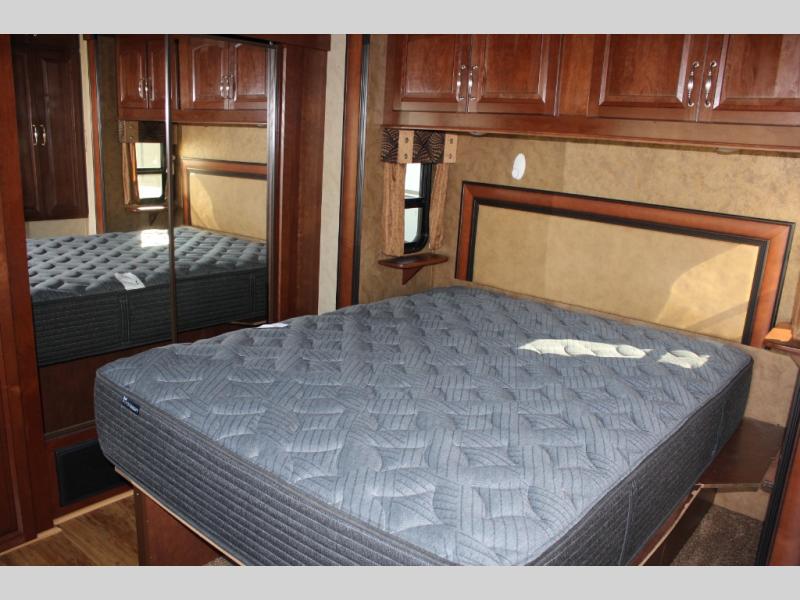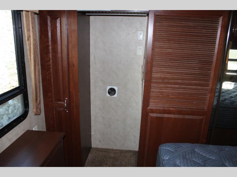 The rear bedroom offers a queen bed slide, a wardrobe, washer and dryer prepped, and drawers. You will also find a dresser opposite the bed for additional storage. There is a convenient second entry door into the bedroom.