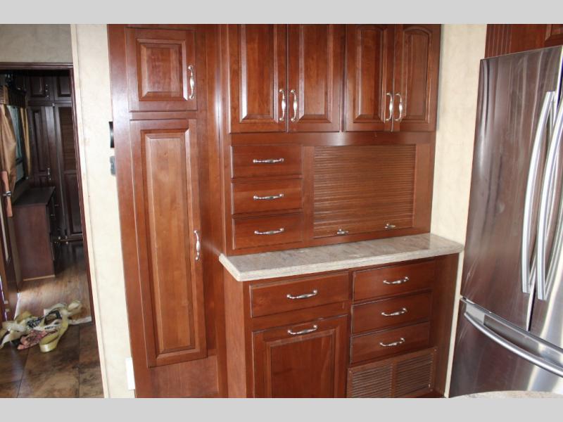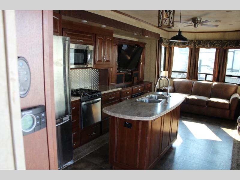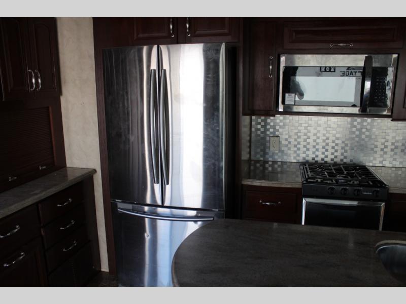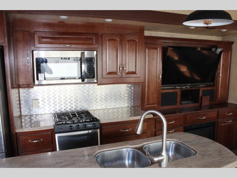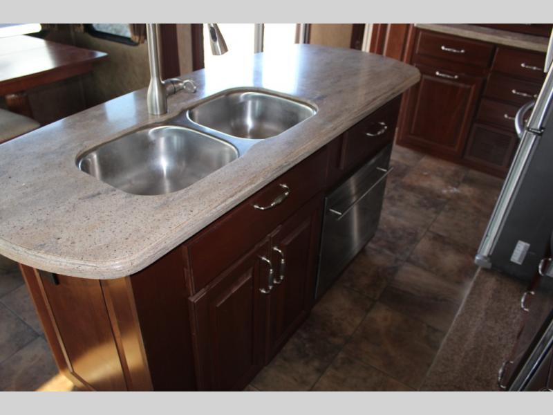 Inside the front main entrance to the right is the kitchen and living area. The kitchen and living area offer two slides which provide much space. The first slide has a free-standing table and chairs and two lounge chairs. In the front of the trailer, there is a sofa with end tables. The second slide offers a refrigerator, pantry, three burner range, microwave, pantry with dressers, and plenty of overhead space. There is also a kitchen island with a double sink.