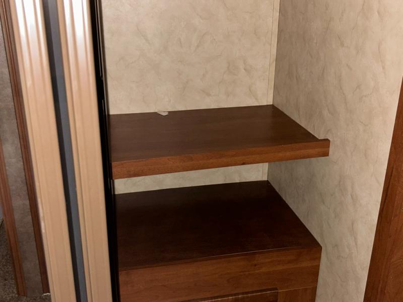 The front bedroom features a queen bed slide with shelves on either side—or opt for a king bed for even more sleeping space. A front wardrobe provides generous storage, and the dresser with a TV adds the finishing touch to your personal hideaway. -