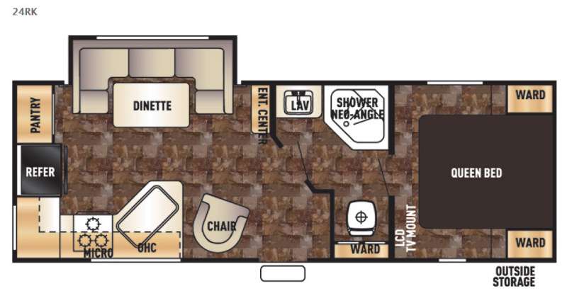 As you enter the trailer, to the left there is a lounge chair. In the kitchen area you will find a double kitchen sink, three burner range, and microwave. Along the rear wall there is a refrigerator, large pantry, and extra counter space for food prep. Along one side of the trailer you will find a u-dinette slide and adjacent to the slide there is an entertainment center.