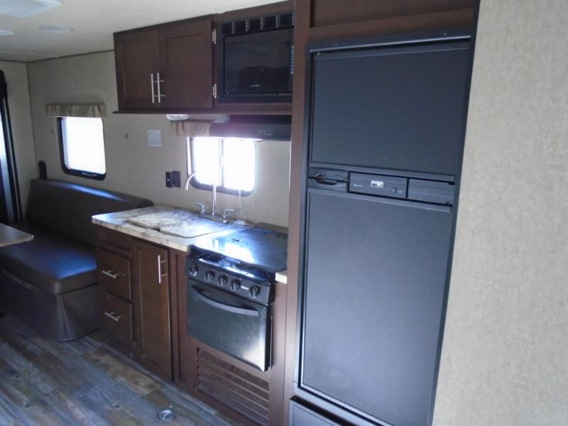 There are plenty of overhead cabinets throughout the travel trailer as well as outside storage.